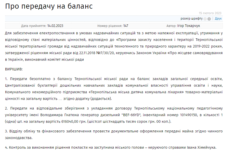 Ще 19 генераторів за рішенням виконкому від 14 лютого 2023 року №147 «Про передачу на баланс» закупили школам і дитсадкам «для забезпечення електропостачання в умовах надзвичайних ситуацій і для гарантованого постачання тепловою енергією в умовах припинення подачі природного газу». На сайті Тернопільської міської ради йдеться про те, що генератори передали на баланс закладів загальної середньої освіти та Централізованої бухгалтерії дошкільних навчальних закладів комунальної власності управління освіти і науки.