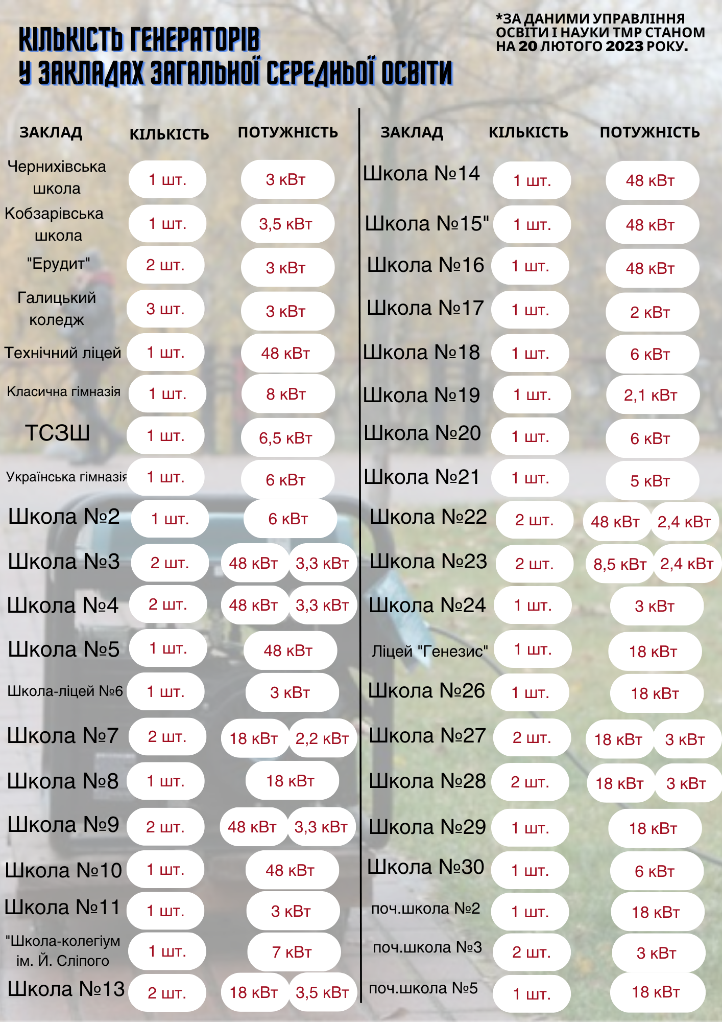 Начальниця управління освіти Тернопільської міської ради Ольга Похиляк у відповіді на запит зауважила, що «заклади освіти забезпечені генераторами відповідно до потреб». Та чи потужні вони?