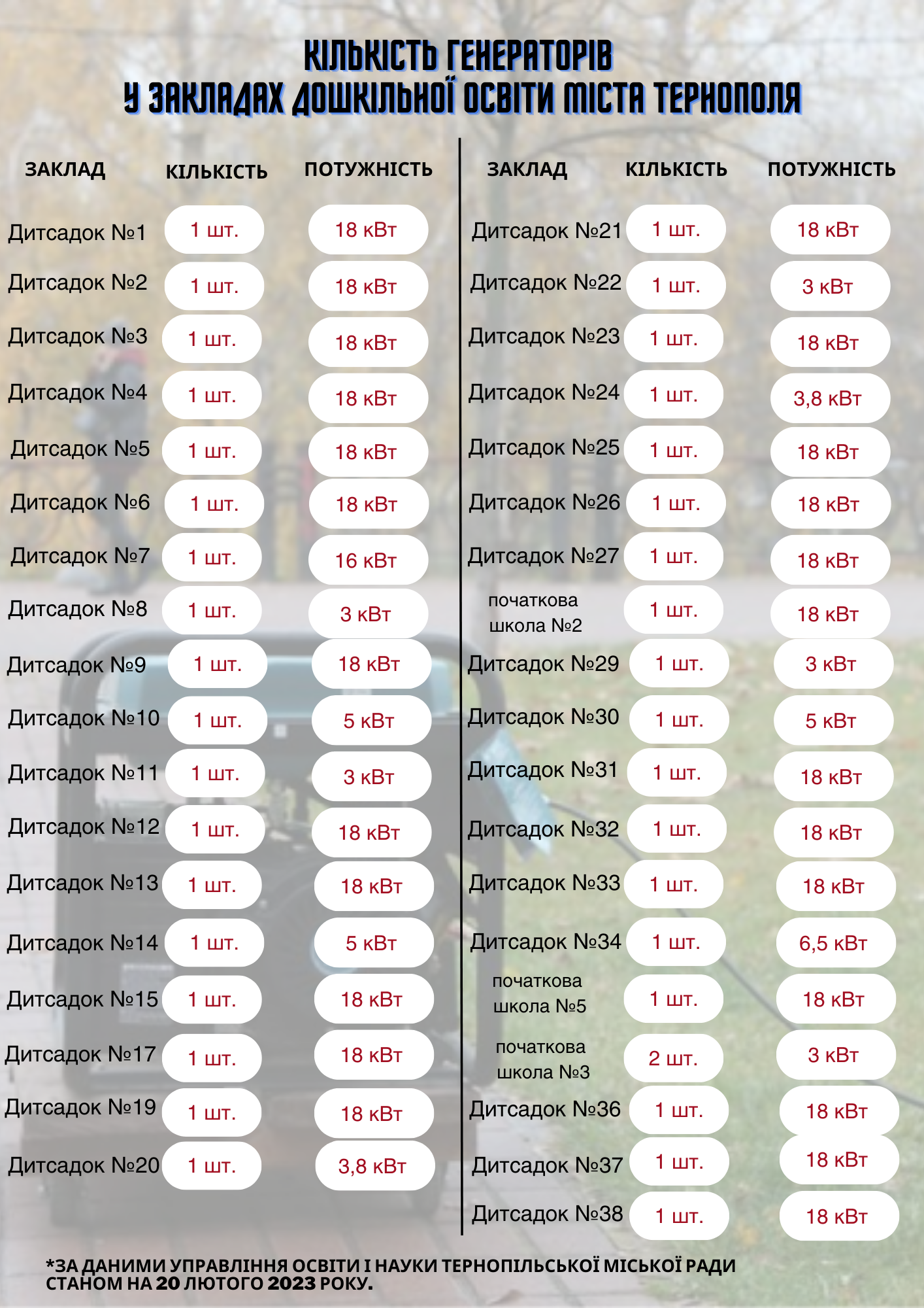 У всіх інших вони мають значно меншу потужність. Зокрема, для трьох дошкільних закладів (№10, №14 і №30) закупили пристрої потужністю у 5 кіловат. Дитсадки №20 і №24 отримали для власного користування генератори потужністю у 3,8 кВт. Найменш потужні пристрої у 3 кіловати експлуатують у п’яти закладах – №8, №11, №22, №29 та у Тернопільській початковій школі №3 (тут є два генератори).