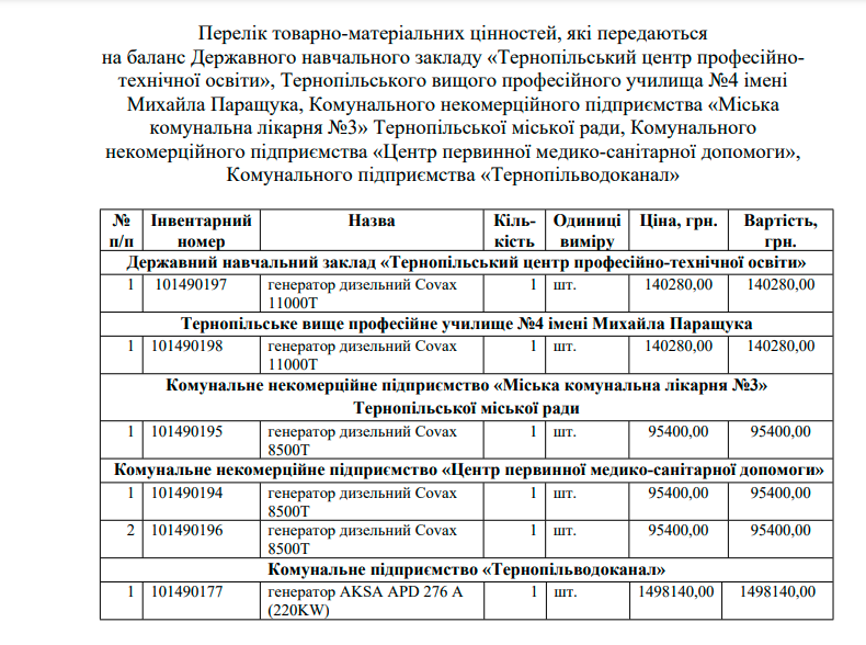 Насамкінець, 2 генератори навчальні заклади отримали за рішенням виконкому від 20 лютого №179 «Про передачу матеріальних цінностей» для забезпечення світла в умовах надзвичайних ситуацій. Їх з балансу Тернопільської міської ради передали для Тернопільського центру професійно-технічної освіти та Тернопільського вищого професійного училища №4 імені М. Паращука. Обидва заклади отримали по дизельному генератору Covax 11000T на суму 140 280 гривень. Однак, незрозуміло, чому від Управління освіти і науки ТМР вказали їх у запиті, якщо ми питали про школи і дитсадки!