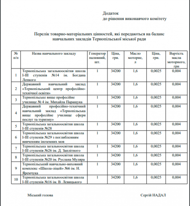 Ми перевірили їх усі та дізнались «бажані» суми. 10 генераторів освітнім закладам міста передали відповідно до рішення виконкому від 4 травня 2022 року №428 «Про передачу на баланс». Мета – забезпечення резервного електроживлення у випадку відключення електропостачання у захисних спорудах цивільного захисту населення. На сайті міської ради вказано, що генератори отримали ТЗОШ №14, Тернопільський центр професійно-технічної освіти, училище № 4 ім. Михайла Паращука, Тернопільська вище професійне училище сфери послуг та туризму, школи №16, №20, №26, №28, №29 і «Школа-ліцей» №6 ім. Назарія Яремчука. Кожен пристрій коштував 34 200 грн, тобто загалом вони обійшлись міському бюджету у 342 000 гривень. Окрім генераторів, для навчальних закладів передали моторне масло у сумарній кількості 16 літрів. Кожен заклад отримав по 1,6 л пального. Однак вартість масла у додатку до рішення виконкому вказана незрозуміла – 0,0025 грн на заклад.