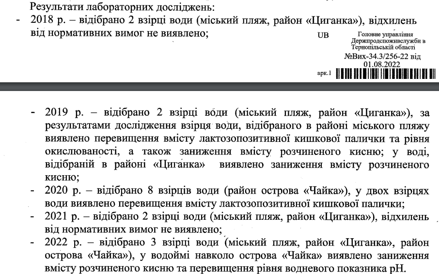 Аби визначити, чи безпечна вода у Тернопільському ставі, наша журналістка звернулась до Управління державного нагляду за дотриманням санітарного законодавства Головного Управління Держпродспоживслужби. Ми попросили надати результати щорічних досліджень проб води зі Ставу за останні 10 років. Нам відповіли, що регіональна державна лабораторія Держпродспоживслужби в Тернопільській області була акредитована у 2018 році.
