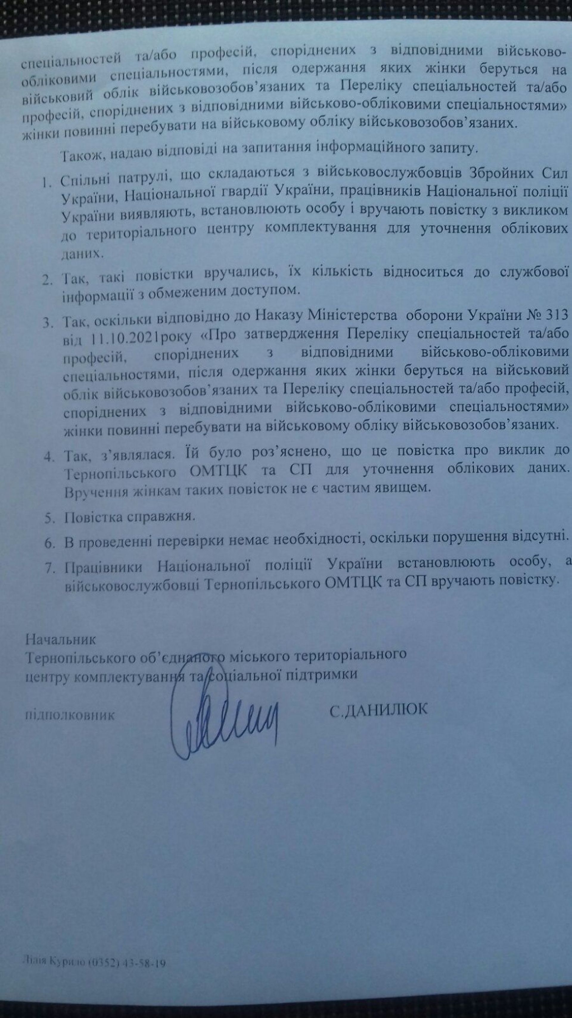 Документ, який їй вручили, був з печаткою та за підписом начальника Тернопільського об’єднаного міського центру комплектування та соціальної підтримки. У редакцію вона скинула копію повістки. При зустрічі у військкоматі жінці сказали, що здивовані самі, чому так сталося.