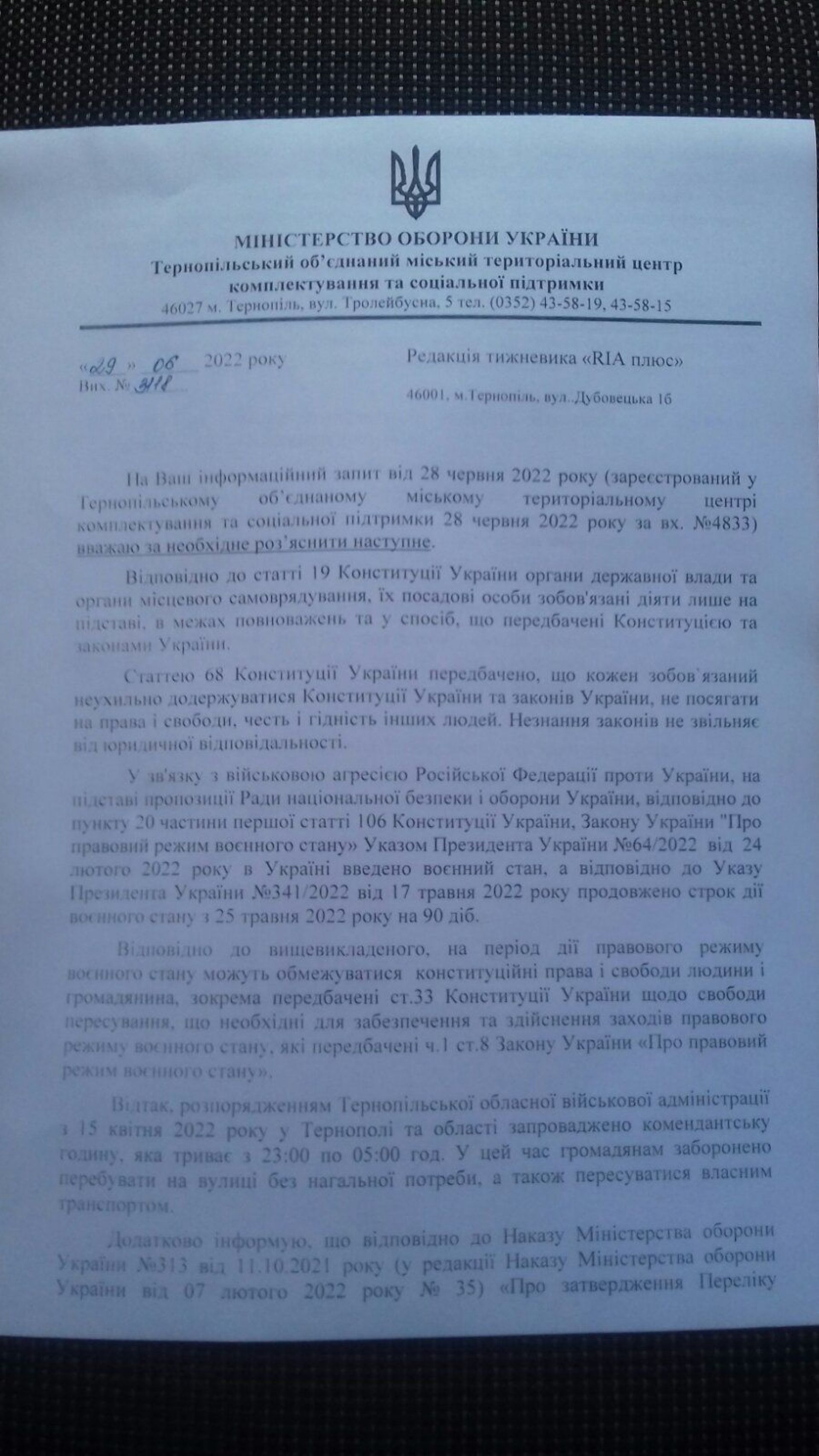 Перед тим, як перейти до самого листа, нагадаємо, що тернополянка Вікторія 26 червня, як сама розповідає, затрималася у подруги. О 23.05 вона чекала на авто, яке мало її забрати додому. У цей час до неї підійшли чоловіки у формі, з її опису, це був патруль. На місці вручили повістку, з якою вона через два дні пішла у міський центр комплектування.