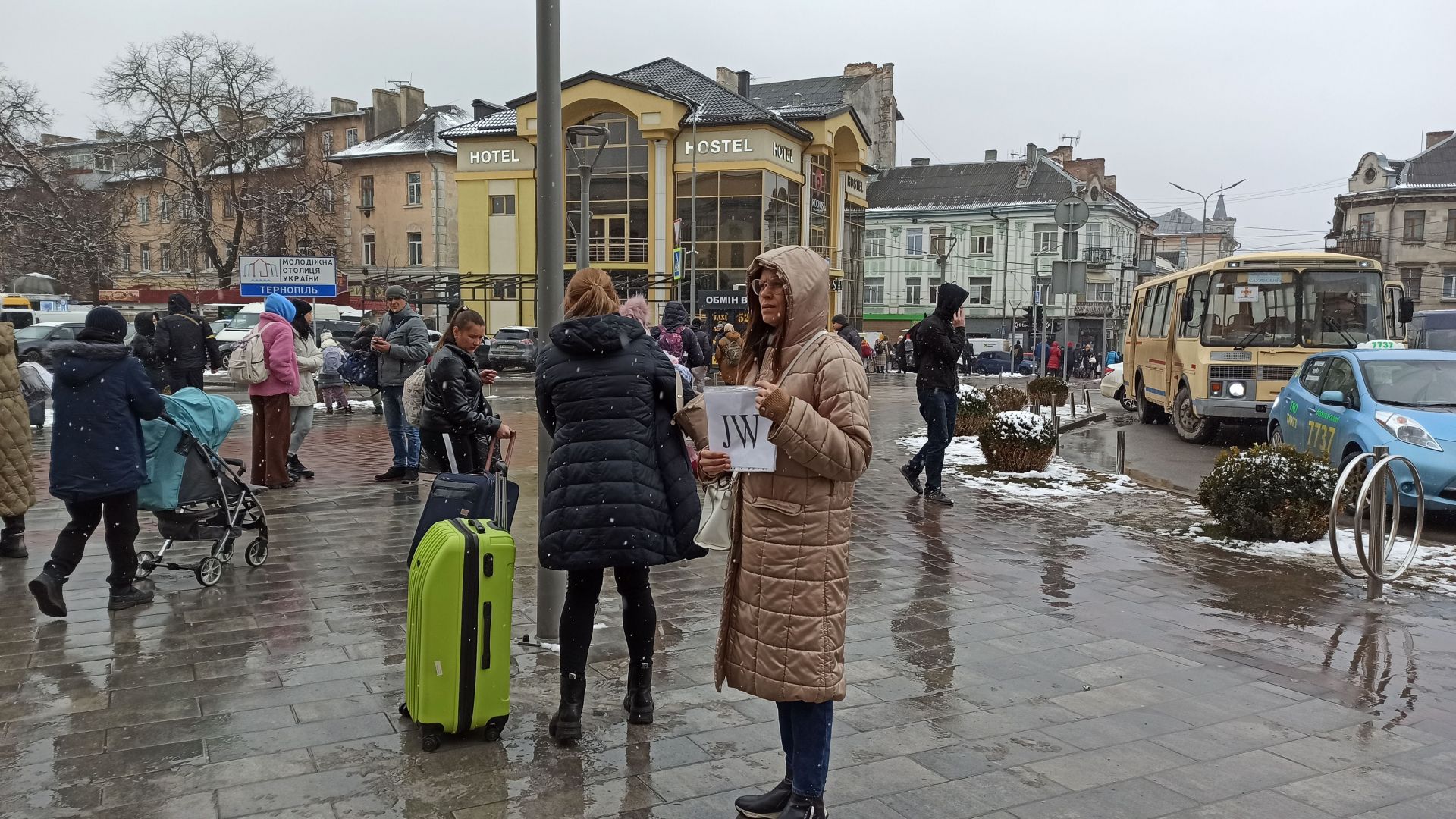 Ксенія із донькою шукали транспорт, аби добратися до кордону із Польщею. Говорять, що дивилися на розклад поїздів – буде до Львова, але людей, охочих їхати, сила-силенна, і квитків вже, схоже, немає. Ксенія розпитує мене про перевізників – чи зможе їх хтось довезти. Каже, що не мають багато грошей з собою, не встигли взяти.