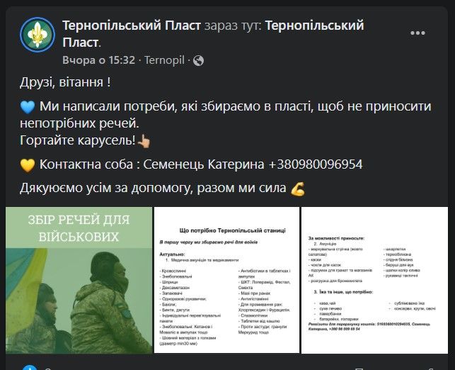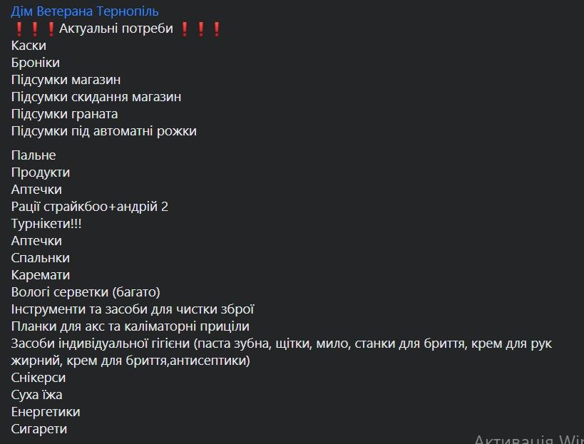 - За можливості приносити військове спорядження: маркувальна стрічка (жовто-салатового кольору), каски, чохли для касок, підсумки для гранат та магазинів АК, розгрузка для бронежилета, шкарпетки, термобілизна, спідня білизна, беруші для вух, шапки кольору олива, рукавиці тактичні.