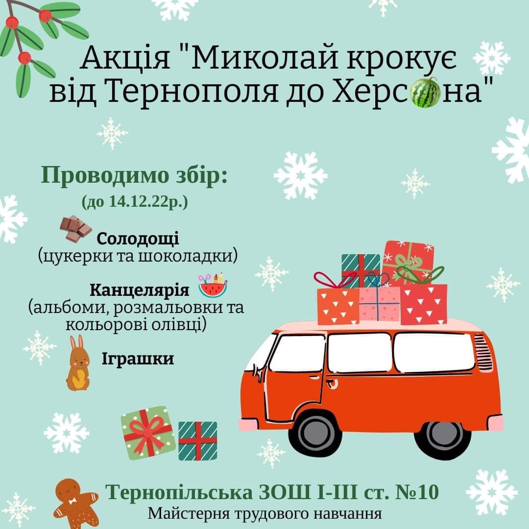 - У Тернопільській ЗОШ №10 організували акцію «Миколай крокує від Тернополя до Херсона». У закладі збирають подарунки для дітей Херсонщини.