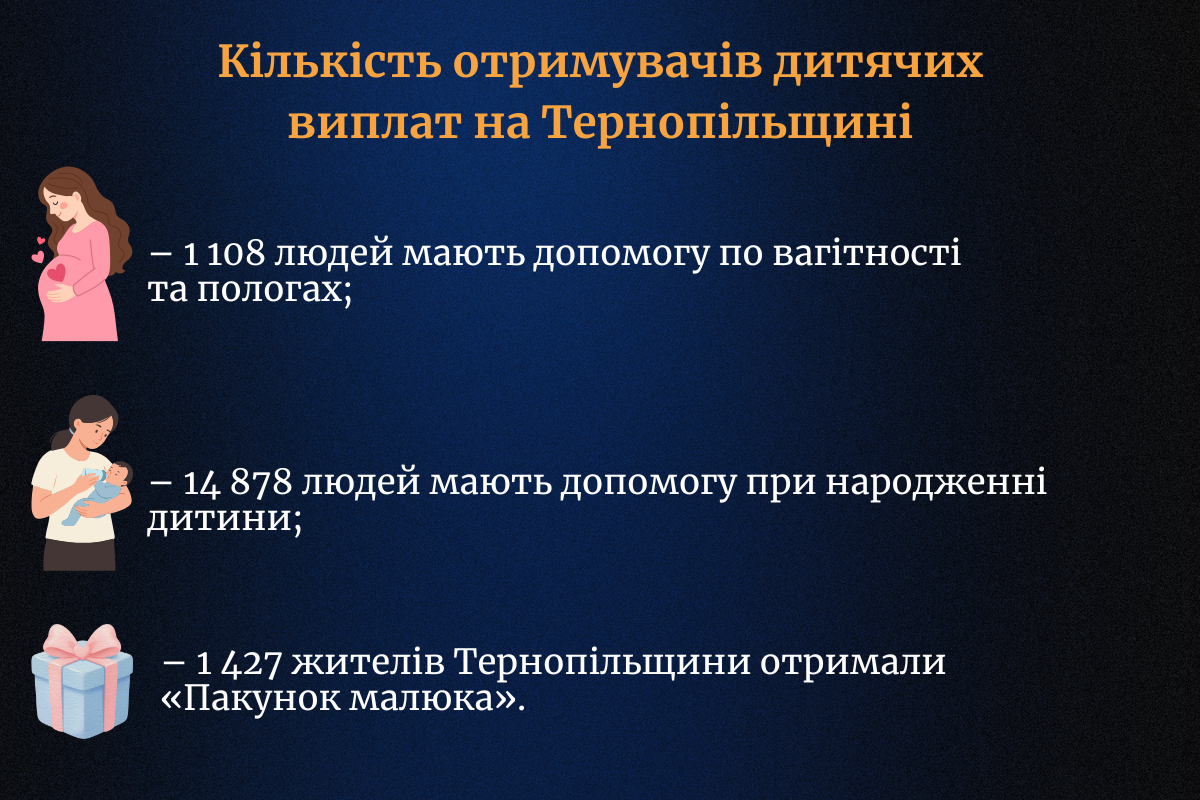Після народження дитини тернополянки можуть обрати між «Пакунком малюка» та грошовою компенсацією. Наразі розмір грошової виплати – 8 451 гривень. Зросла кількість товарів, що мають найбільший попит: додали більше теплого одягу, пелюшок та збільшили розмір пледа. До пакунка тепер входить практичний посібник для батьків «Від народження до року». Подати заяву на отримання «Пакунка малюка» можна від 36-го тижня вагітності або протягом 30 календарних днів після народження. Якщо батьки обрали «Пакунок», його видадуть у пологовому будинку одразу після народження дитини.