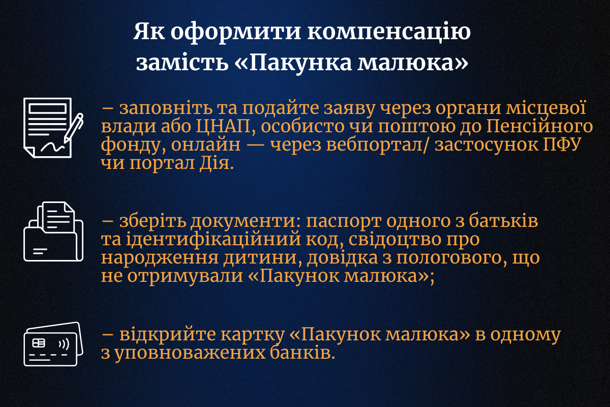 Важливо! Подати документи для призначення виплат можна особисто або поштою до Пенсійного фонду України, в електронній формі через вебпортал або мобільний застосунок ПФУ, портал Дія, а також через ЦНАП, органи місцевого самоврядування чи в межах комплексної послуги «єМалятко».