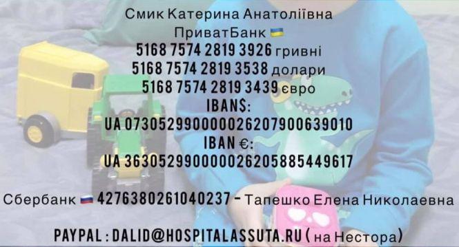 Переказати кошти на лікування 4-річного Нестора Смика можна на картковий рахунок ПриватБанку матері Катерини: 5168 7574 2819 3926.