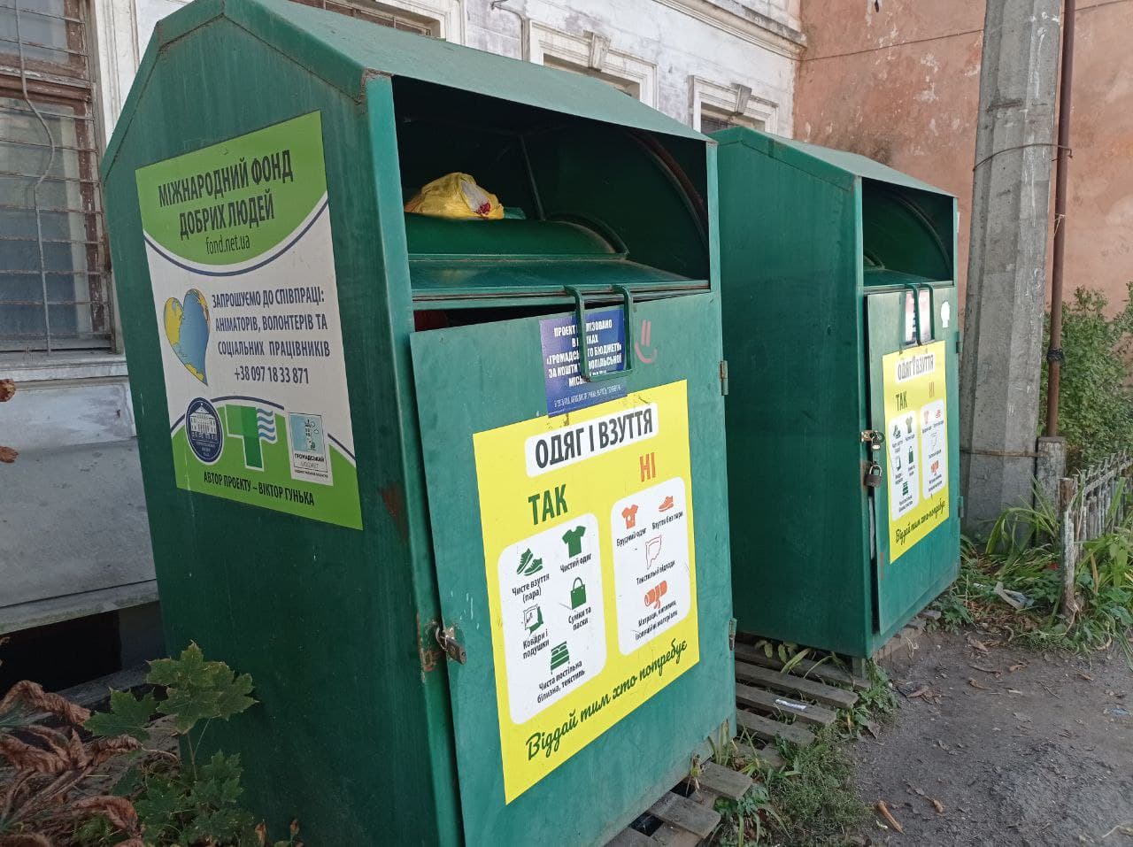 Два контейнери розташовані біля «Фонду добрих людей» за адресою вул. Князя Острозького, 32. Як нам розповіли у самому фонді, наразі найбільша потреба в дитячому одязі. Тому якщо ваші діти виросли і залишився одяг в хорошому стані – ви можете допомогти іншим.