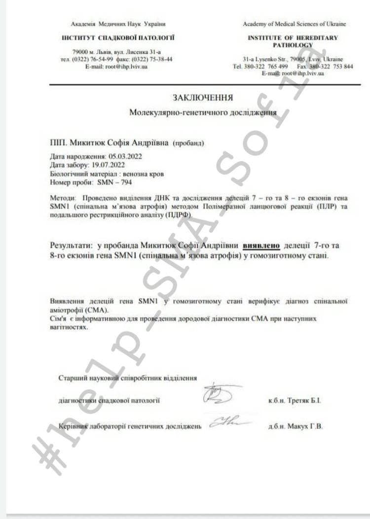 СМА 1 типу – найбільш тяжка форма захворювання, тож пацієнти потребують невідкладного лікування та реабілітації. Наразі п’ятимісячна Софійка Микитюк очікує на додаткове обстеження у Національній дитячій спеціалізованій лікарні МОЗ України «Охматдит». Натомість кожен день і місяць йде не на користь тернополянки.