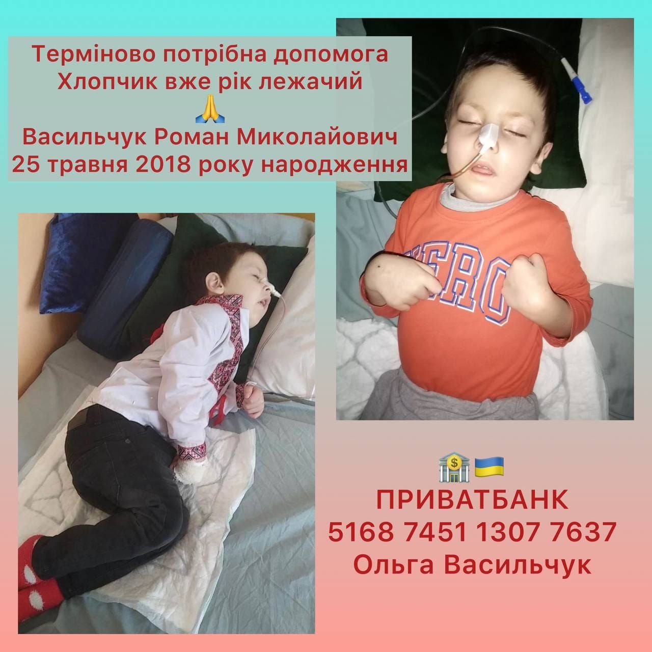 - Чотирирічний житель села Коханівка Роман Васильчук бореться з герпесним енцефалітом та спастичним тетрапарезом. Саме ця хвороба за рік забрала у допитливого, активного хлопчика дитинство і прикувала його до ліжка.