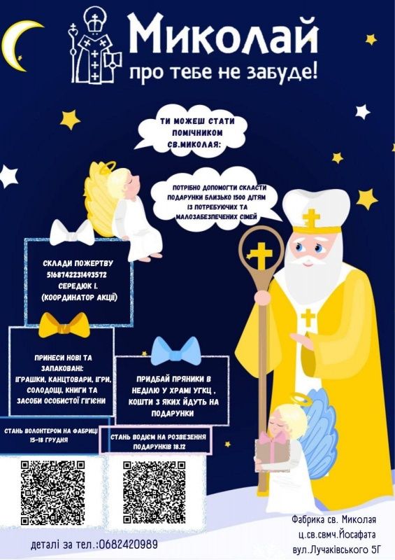 Долучитися до акції можуть усі охочі, залишивши на «Фабриці Святого Миколая», що у приміщенні храму Святого Йосафата (вул. Володимира Лучаковського, 6-Г), у греко-католицьких храмах міста або принести у навчальні заклади: солодощі, канцтовари, засоби особистої гігієни, нові іграшки лише в індивідуальній упаковці.