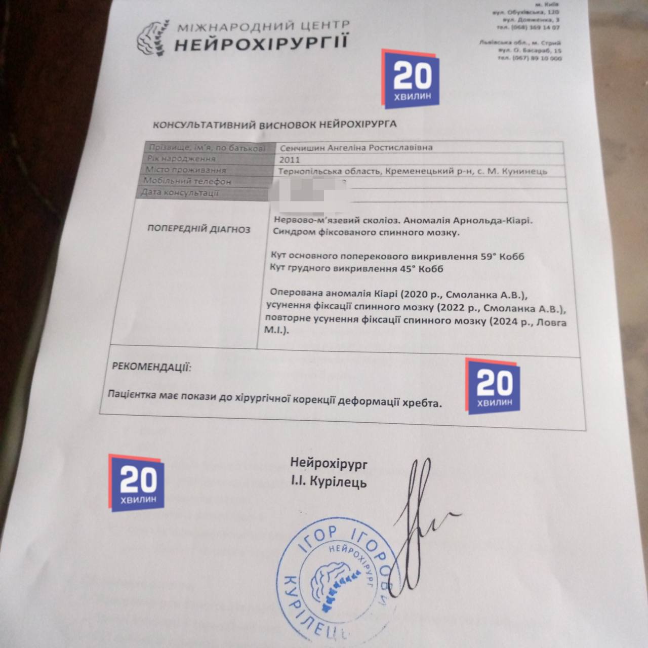 – У доньки S-подібний сколіоз. Кут основного поперекового викривлення – 59 градусів, кут грудного викривлення – 45 градусів. Нейрохірург повідомив, що донька має покази до хірургічної корекції деформації хребта. Як пояснили лікарі, у спину Ангеліни будуть вкручувати спеціальні металеві конструкції, що підтримуватимуть її поставу. Загалом, без цієї операції нам не обійтися, – наголошує мама дівчинки.