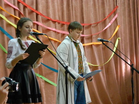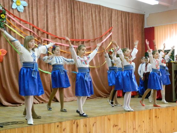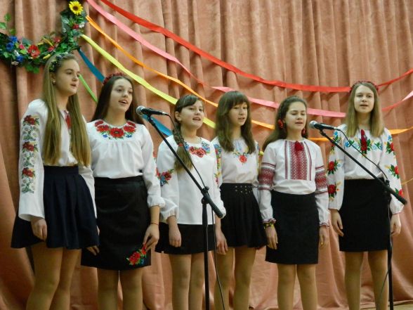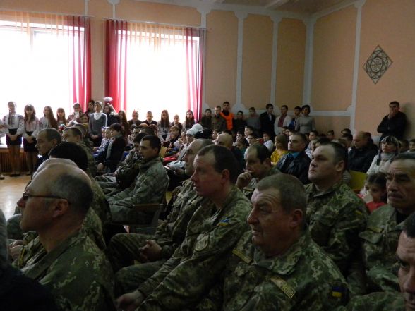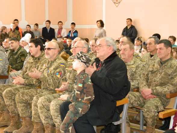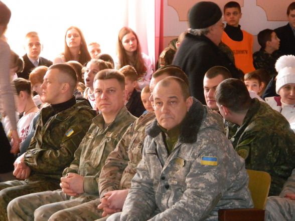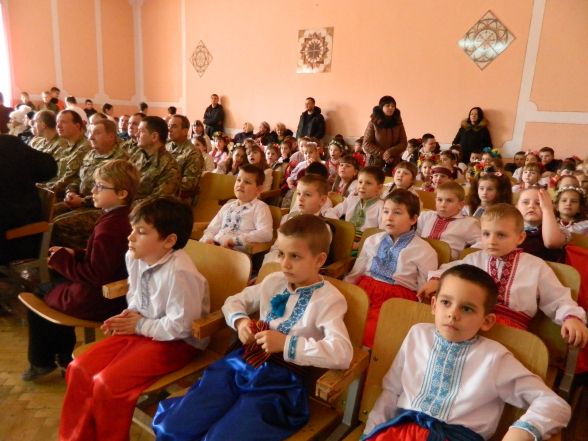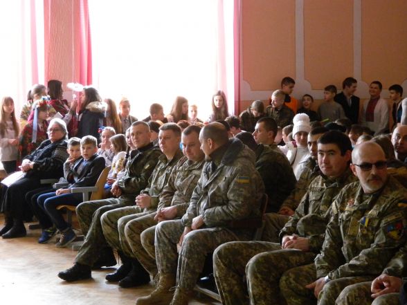 Школярі прийшли на концерт у вишиванках, на сцені вони співають, танцюють, навіть підготували вертеп. Загалом концерт на патріотичну тематику. Загалом, із бійцями батальйону «Тернопіль» школа товаришує вже давно.