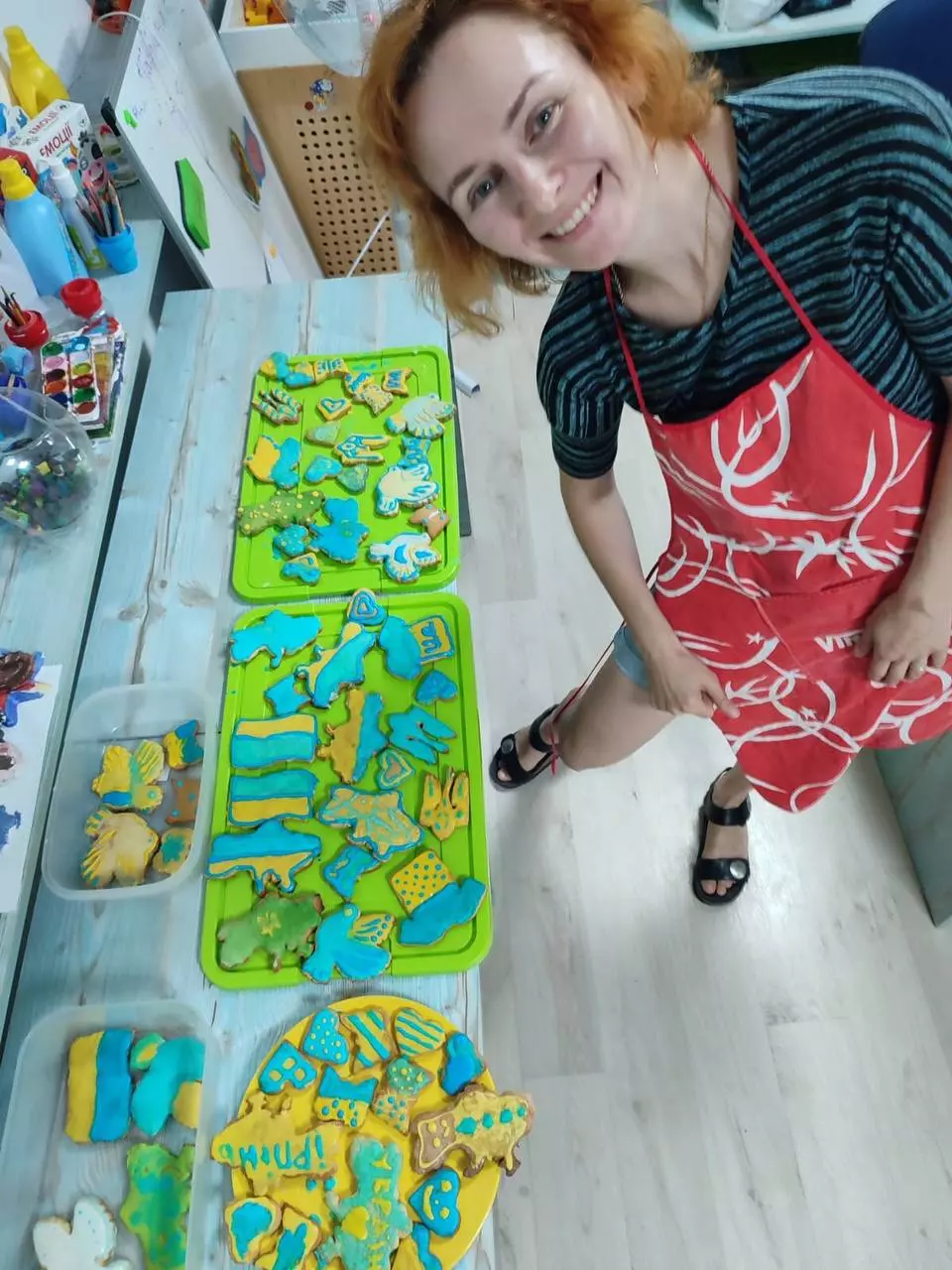 – Так, ми ось тут на вулиці Слівенська, поблизу книжкового магазину, виносимо столик, розкладаємо свої вироби і продаємо. Все, що ви бачите, ми зробили своїми руками. Може трішки нам хтось допомагав, але більшу частину роботи робили ми. Наприклад, я розмальовувала ці чашечки, створювала ці іграшки на ялинку. Пекли разом печиво. Нам зовсім не холодно, адже ми знаємо, що робимо це для Збройних сил України. Для хлопців, які нас захищають, – розповідає вона.