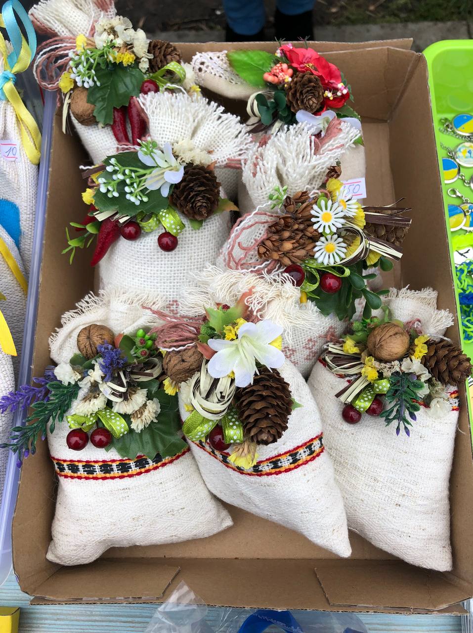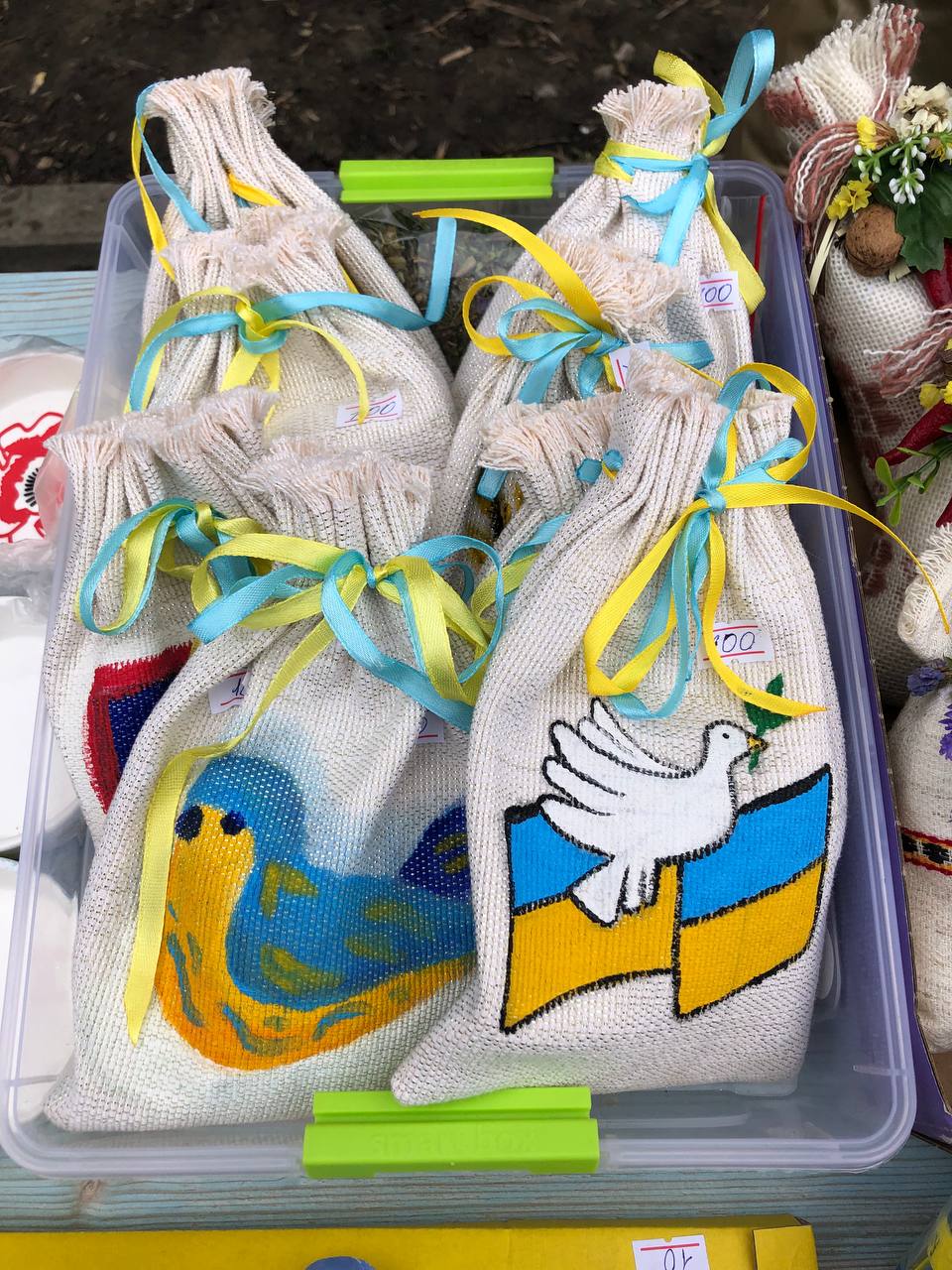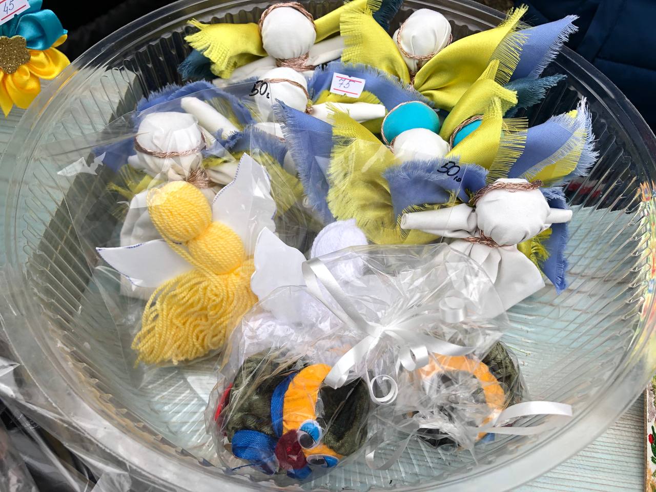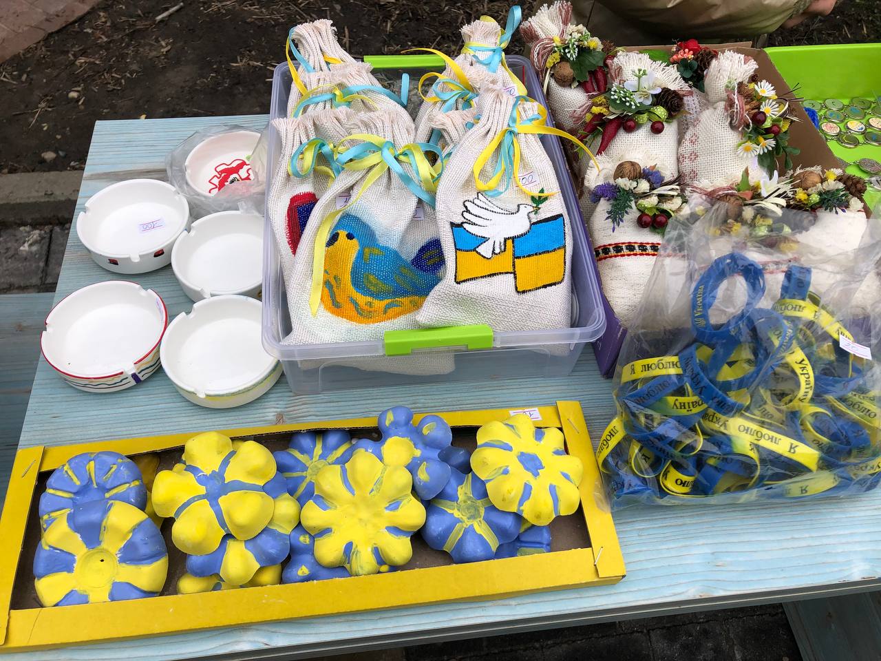 Розмальовані кухлики, обгортки для паспорта, янголи-охоронці, мішечки-обереги та навіть саморобні проукраїнські годинники – вибір продукції чималий. Більше того, придбати можна і солодощі та трав’яний чай.