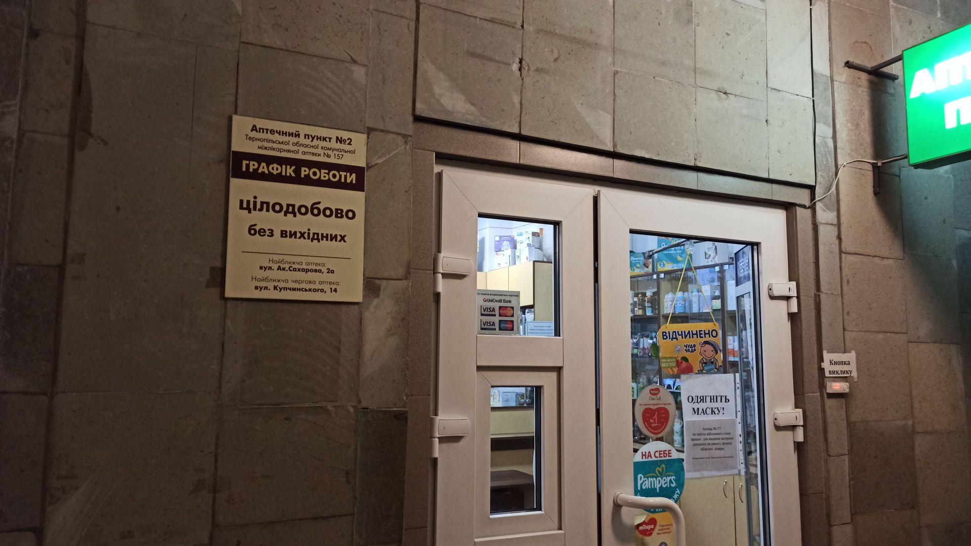 Адреса: вул. Сахарова, 2 (всередині КНП «Тернопільська обласна дитяча клінічна лікарня»). Аптека №157, що міститься в обласній дитячій лікарні, стала цілодобовою з 25 лютого, у зв’язку з подіями в Україні. Вхід в аптеку – через приймальне відділення лікарні, хоча саме її приміщення розташоване всередині лікарняного двору. Ця аптека дійсно працює цілодобово, без вихідних, однак на дверях аптечного пункту №2 висить аркуш з інформацією: «Аптека №157 на період військового стану працює для надання екстреної допомоги на вимогу дитячої обласної лікарні».