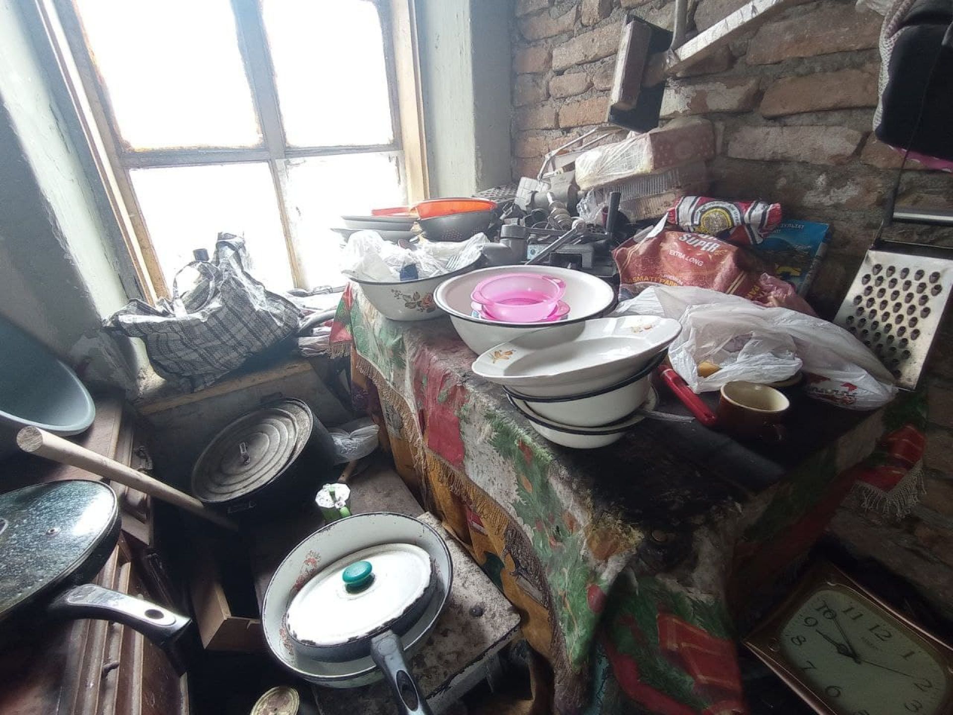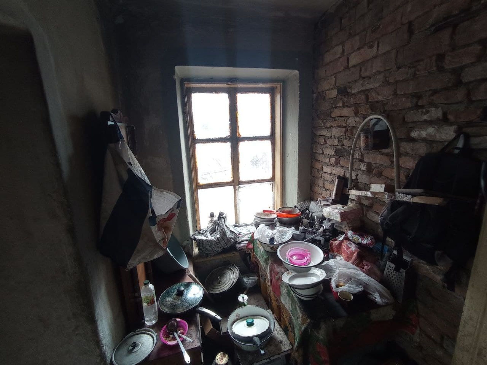 Одразу біля порогу – імпровізована кухня з кухонним приладдям та тарілками. А біля них декілька п’ятилітрових пляшок води, яку чоловік Марії приносить від заводу поблизу.