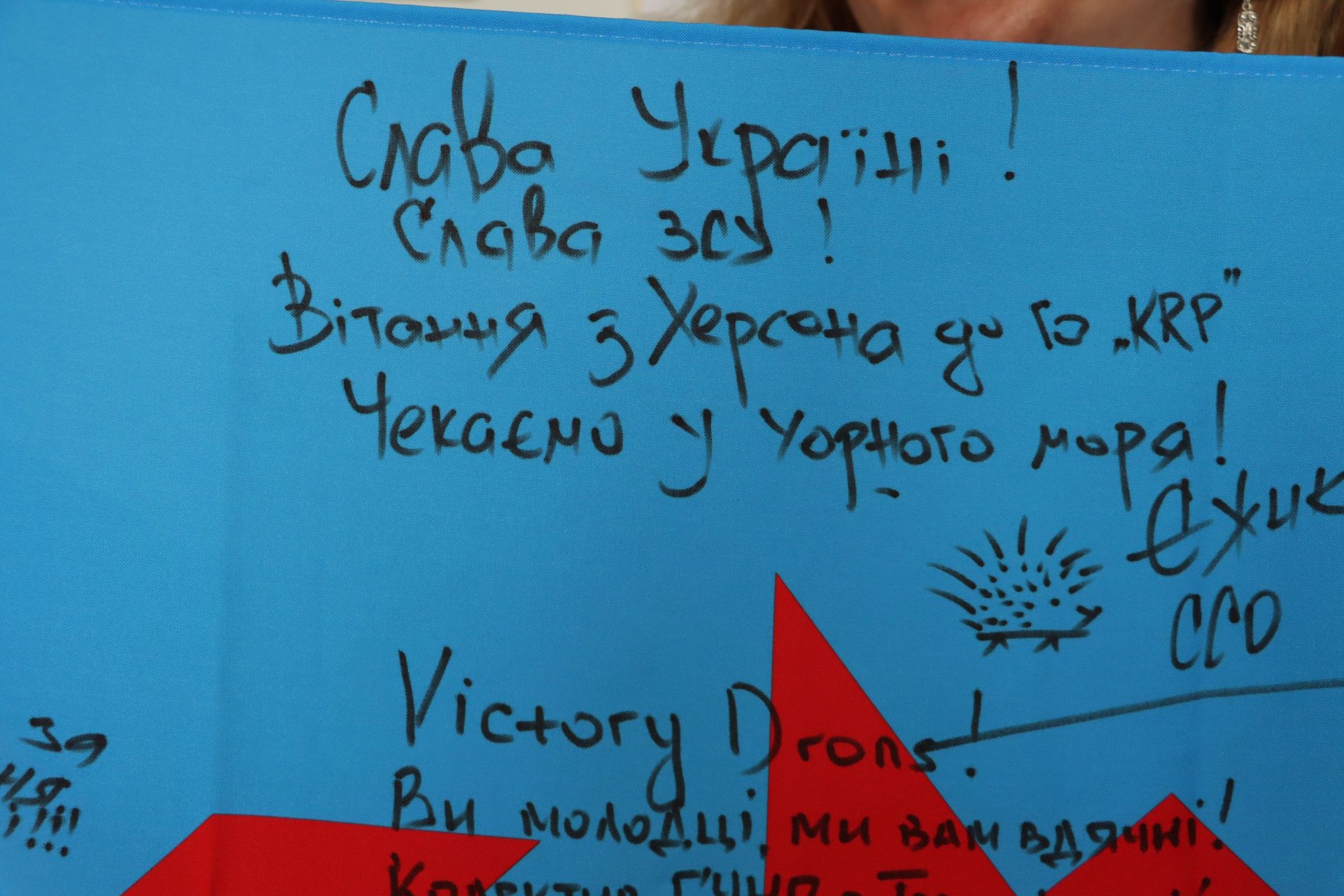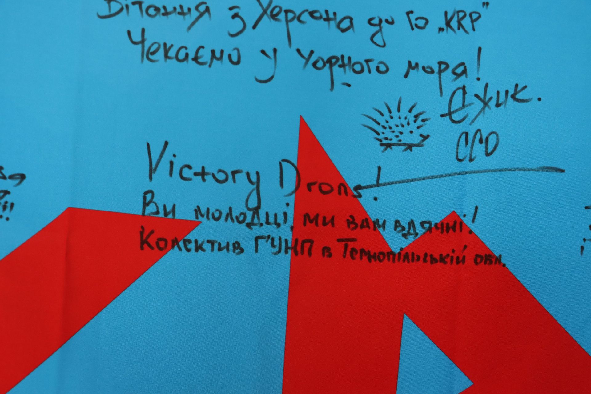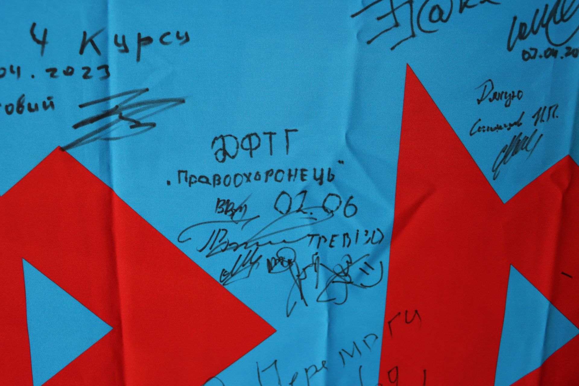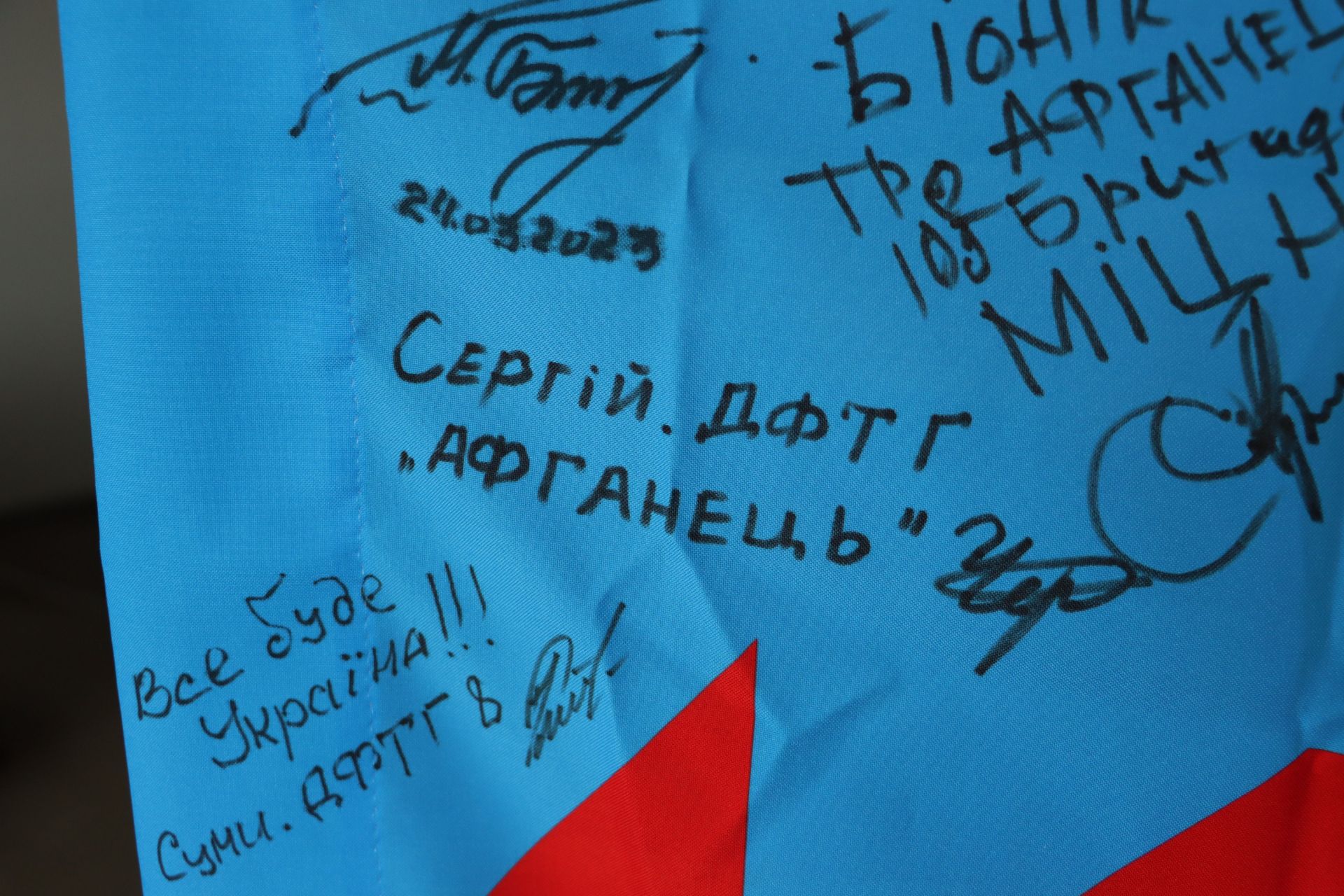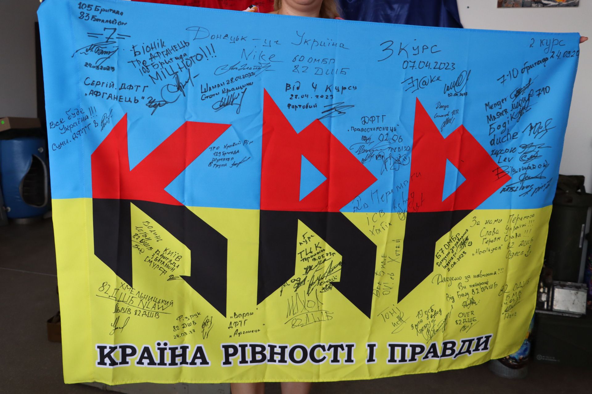 На завершення Юлія та Мар’яна показують нам їхні цінні пам’ятки – прапори із підписами військових із різноманітних бригад та угруповань. Це підписи всіх, хто працює на один результат – знищення російського ворога. Багатьох тих, хто залишив своє прізвище на тканині, вже немає в живих… Тим не менш, усі вони – Герої, і зробили свій неоціненний внесок у Перемогу.