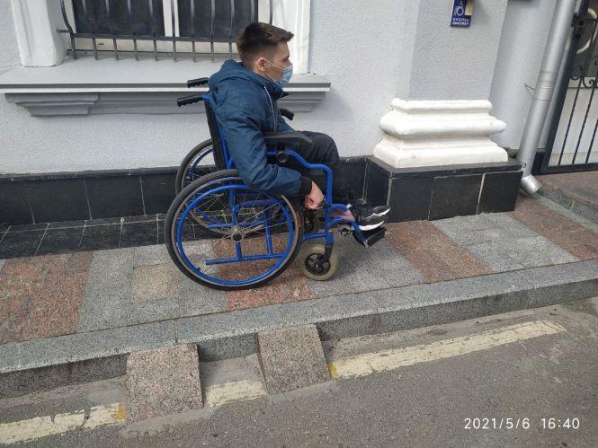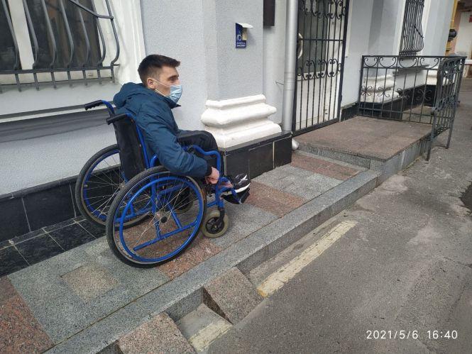 Діставшись до будівлі Управління державної реєстрації бачимо невеликий поріг, а біля нього пандус. Тарас без особливих труднощів піднімається.