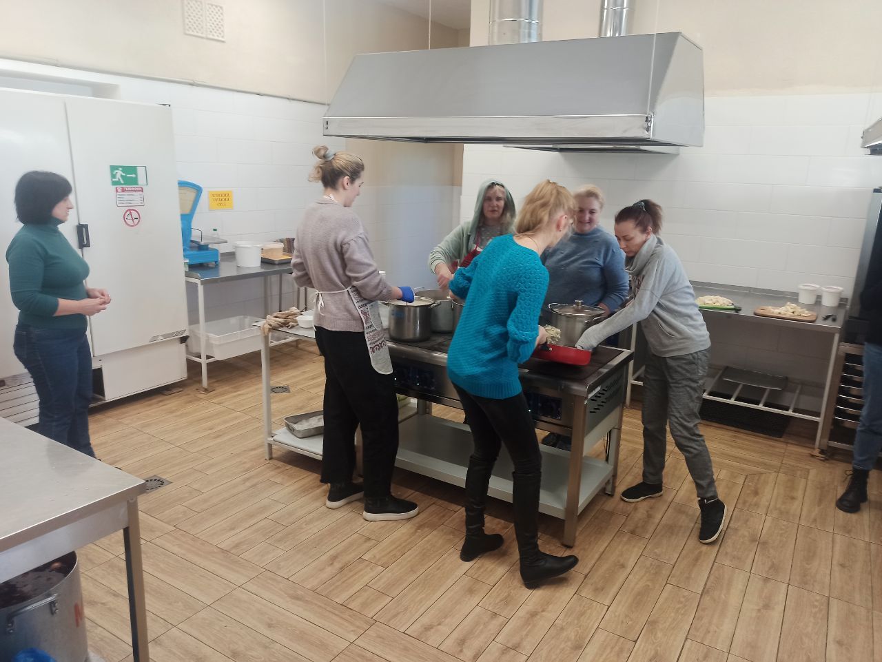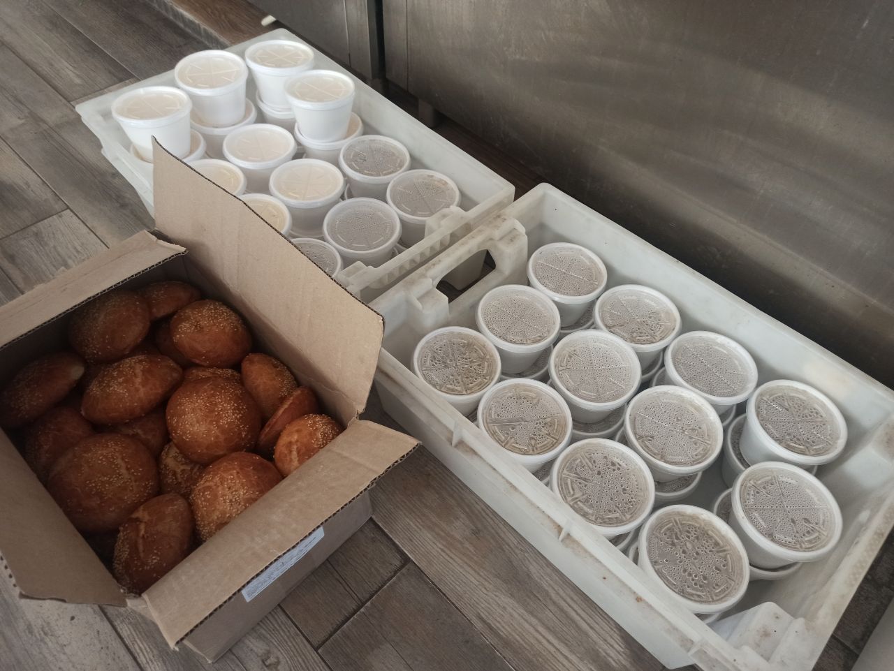 Поки ми розмовляємо, жінки на кухні якраз закінчують розливати гарячу страву по пластикових супничках і пакувати у картонні ящики. Пані Наталя говорить, що поспішають, бо вже обід, пора би хлопцям їсти, а вони трішки не встигли з кухарством.