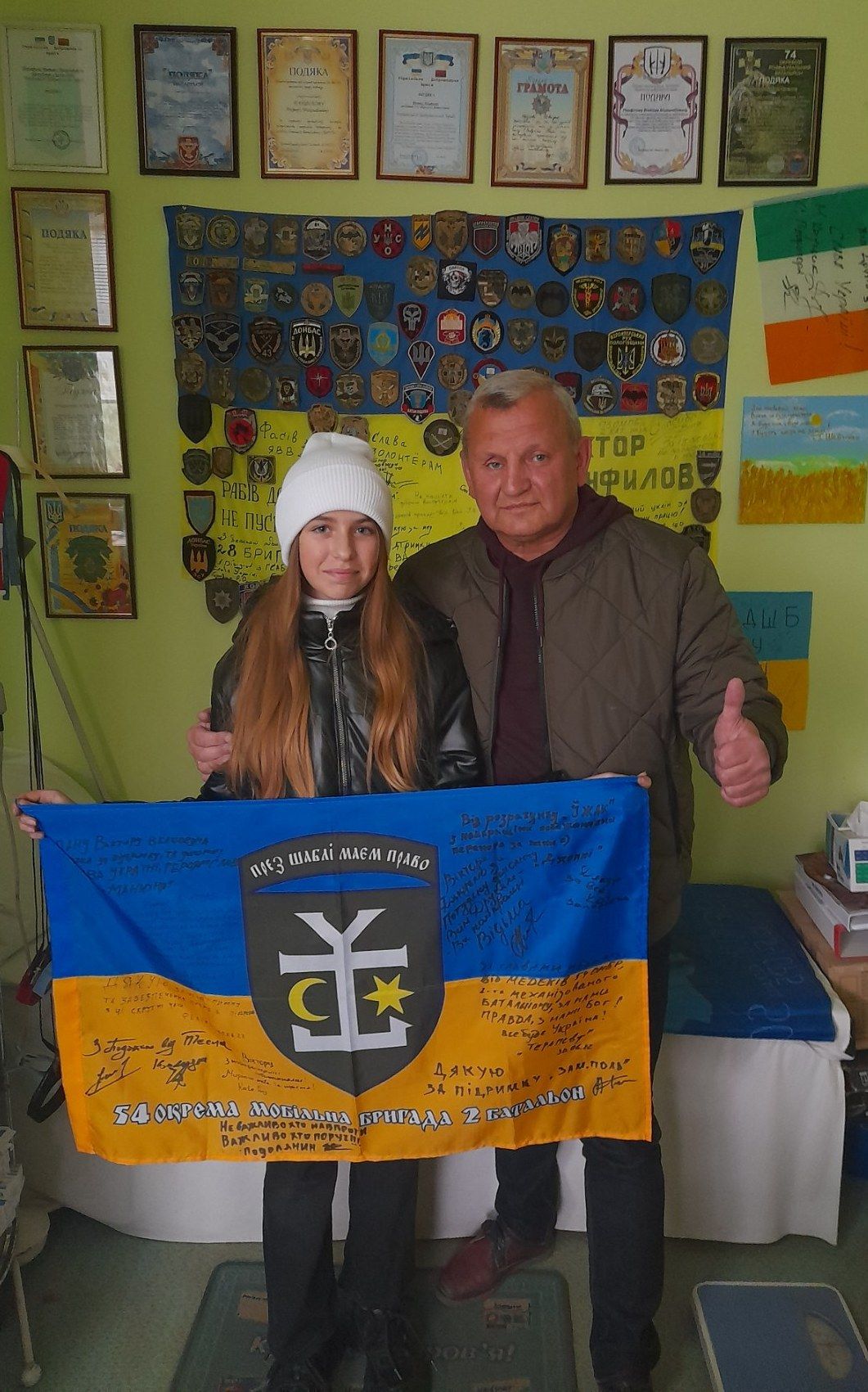 На знак вдячності за допомогу юній волонтерці подарували прапор з підписами бійців 54 бригади.