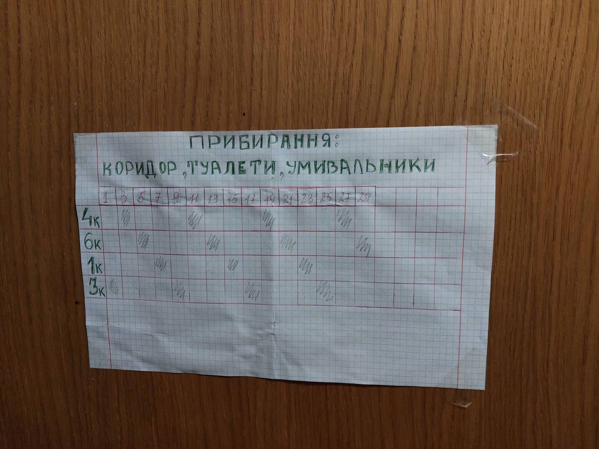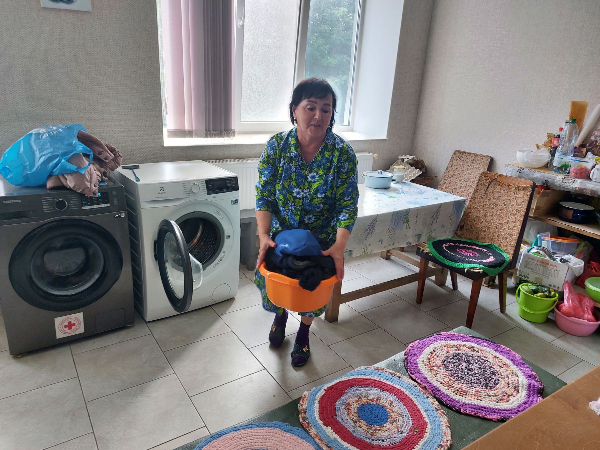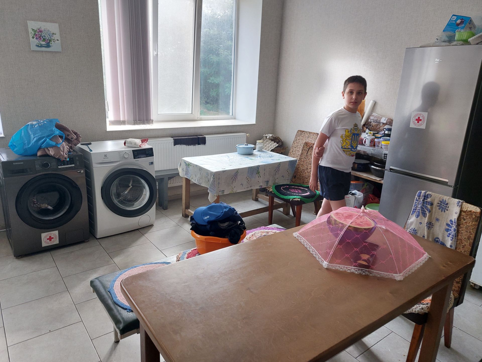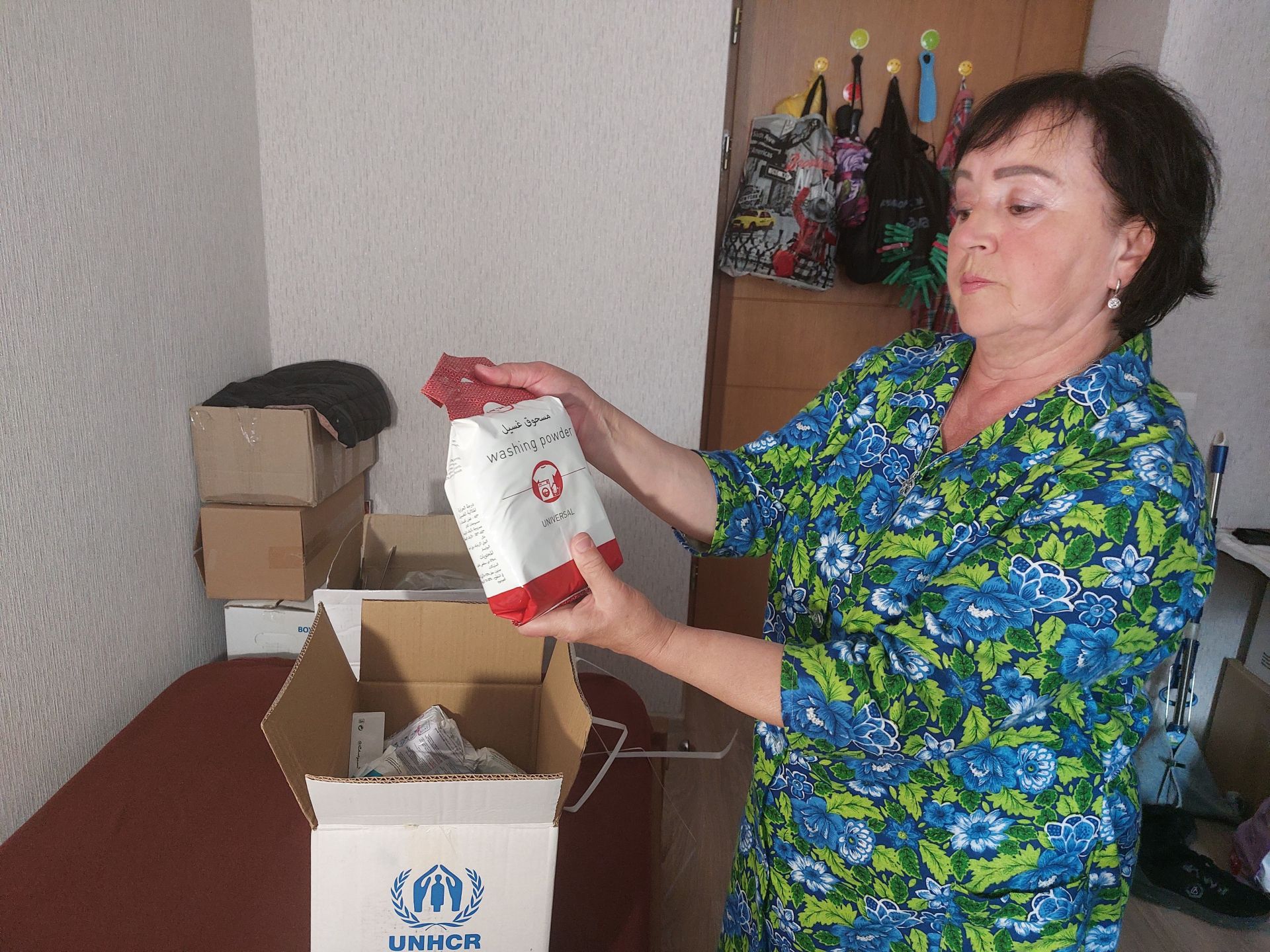 У кімнаті — чотири ліжка, маленька шафка, настільна лампа, невеличкий столик, майже на половину заставлений посудом. Саме тут Дмитрик сідає робити уроки, прибравши чашки зі столу. У кутках — чимало ящиків і коробок. Бабуся пояснює: там зимові речі та той нехитрий крам, яким рідко користуються. Весь одяг в невелику шафку помістити неможливо, хоч і не мають із собою багато. А ще часом дають допомогу: крупи, деякі харчі, побутову хімію та часом посуд. Бо ж переїхали з невеличкою валізою. Саме перед приїздом журналістів жінці принесли дві коробки із допомогою. Ми запропонували поглянути, що там, всередині. Пані Валентина відкрила коробки і показала: в одній було кілька каструль та кухонне приладдя, жінка каже, що її попередили, — це мають поділити із родиною сусідів. У другому ящику були засоби гігієни.
