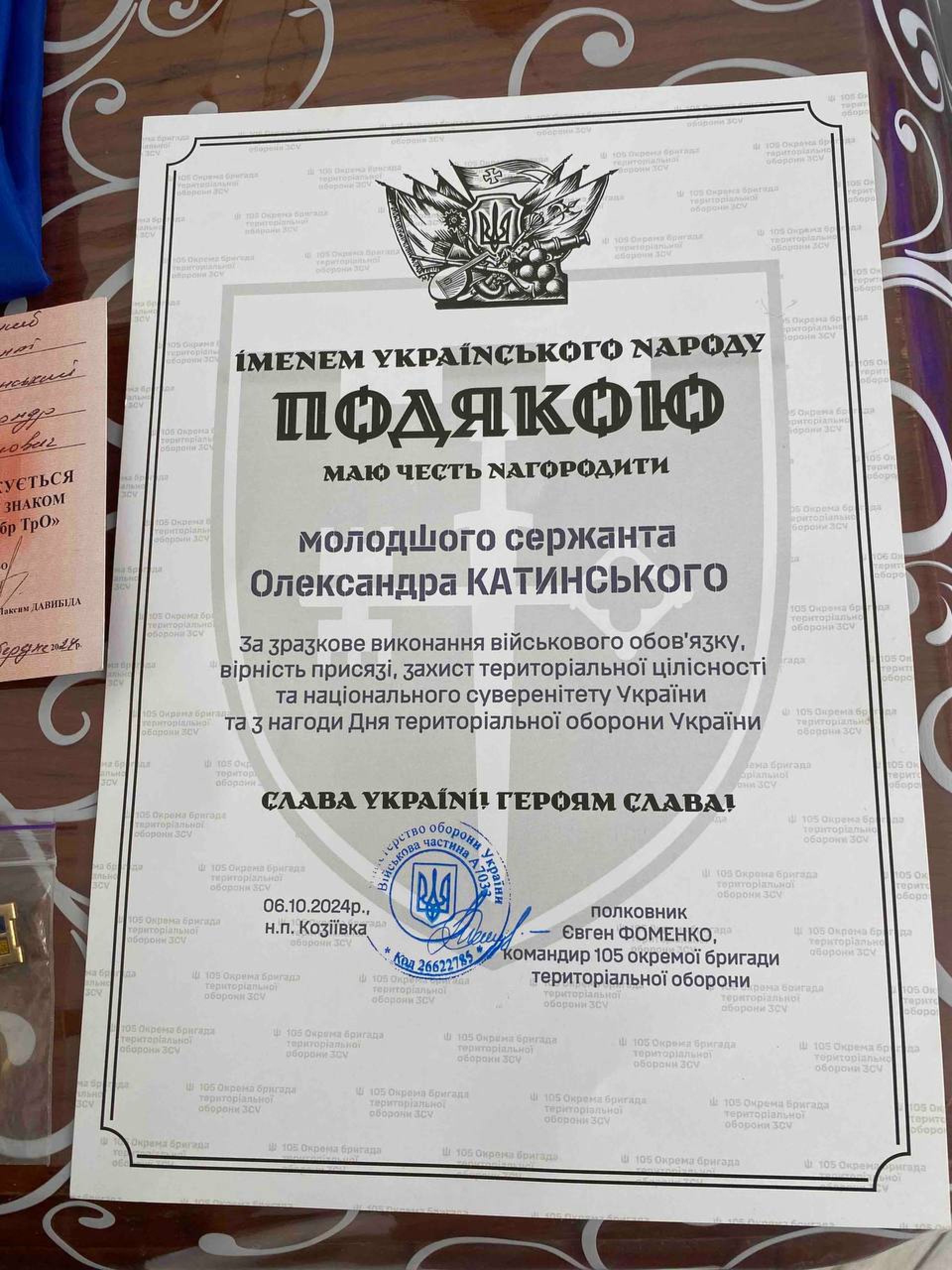 – Він завжди був усміхненим і щирим, випромінював світло навіть у найтемніші часи. Його жарти та слова підтримки допомагали триматися, не падати духом. Для багатьох він став більше ніж другом – братом, який підтримував у найскладніші моменти, додавав сил і віри. Його відсутність неможливо буде заповнити. Він залишиться в пам’яті побратимів назавжди – у спогадах, у спільних пережитих моментах, у кожному рішенні та кожному бою. Його справа житиме. І ті, хто знав його, нестимуть цю пам’ять із собою, – говорять побратими Олександра Катинського.