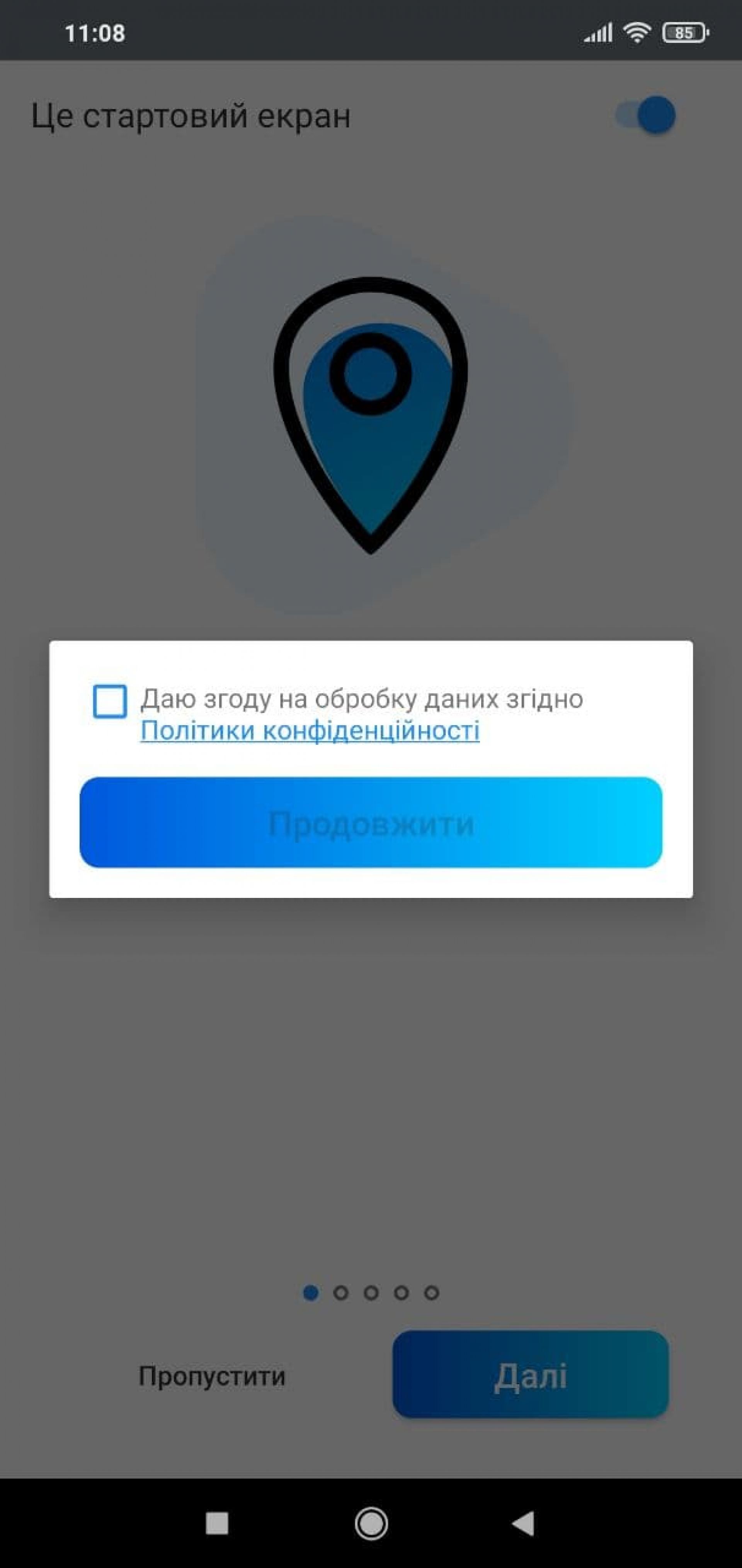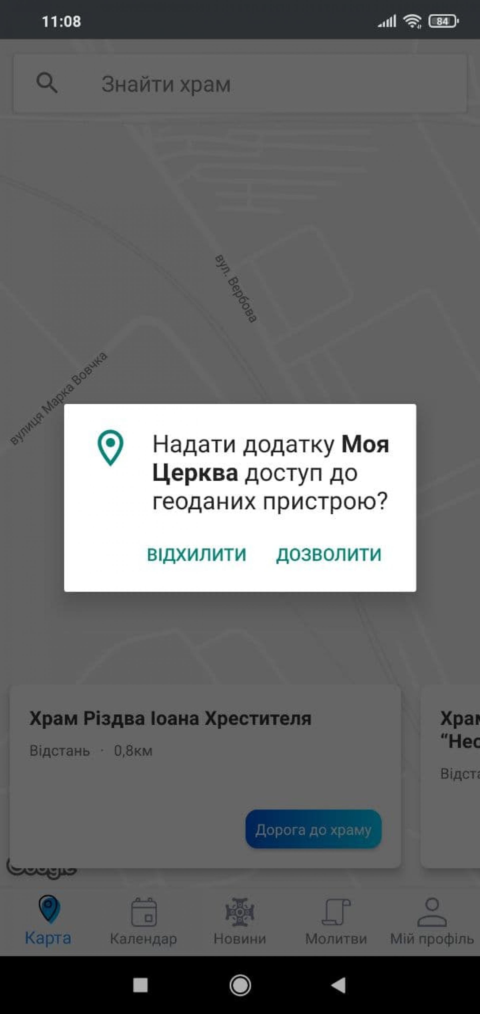 Також додаток просить дозволити доступ до геолокації телефону для відображення вашого місцезнаходження на карті та пошуку найближчих церков. Перед тим ви маєте дати згоду на обробку даних згідно з політикою конфіденційності.