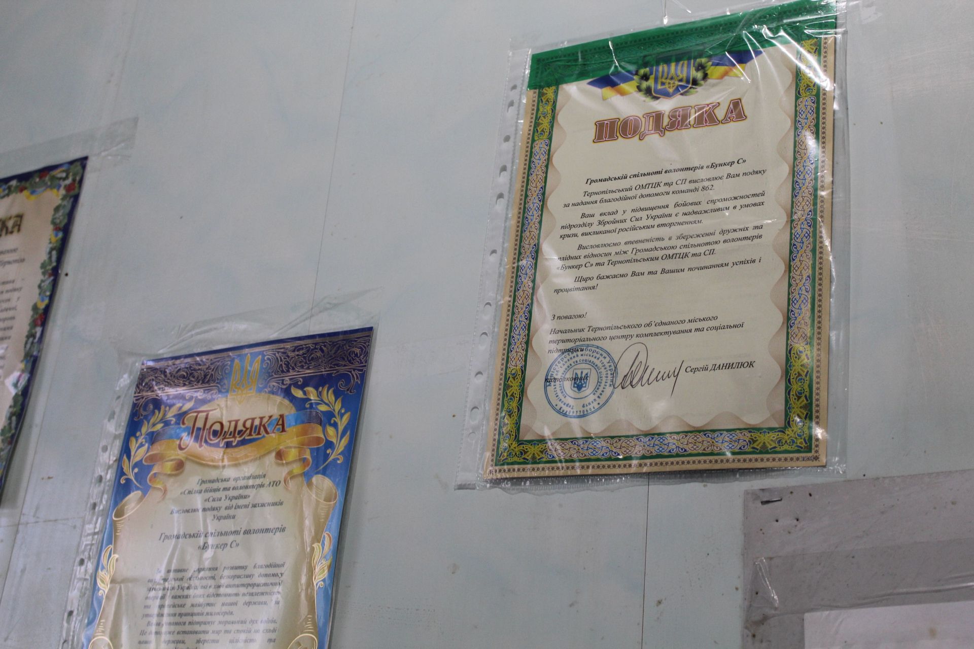 Пані Марія показує нам, з яких приміщень складається їхній волонтерський штаб. Так потрапляємо у мабуть найбільшу тут кімнату, де шумно, ніби у вулику. Стіни у ній завішані грамотами й подяками за активну діяльність, фотографіями в рамочках та патріотичними малюнками. У кутку почепили ікону, над якою око тішить барвистий рушник. В кімнаті ніде проштовхнутись, приміщення заставлене столами, за якими ліплять вареники. Робота кипить просто із шаленою швидкістю, як на конвеєрі. Кожен має свій обов’язок. За першим столом працюють дві Галини – тернополянка і харків’янка. Друга у нашому місті опинилась наприкінці лютого, знайшовши тут надійний прихисток.