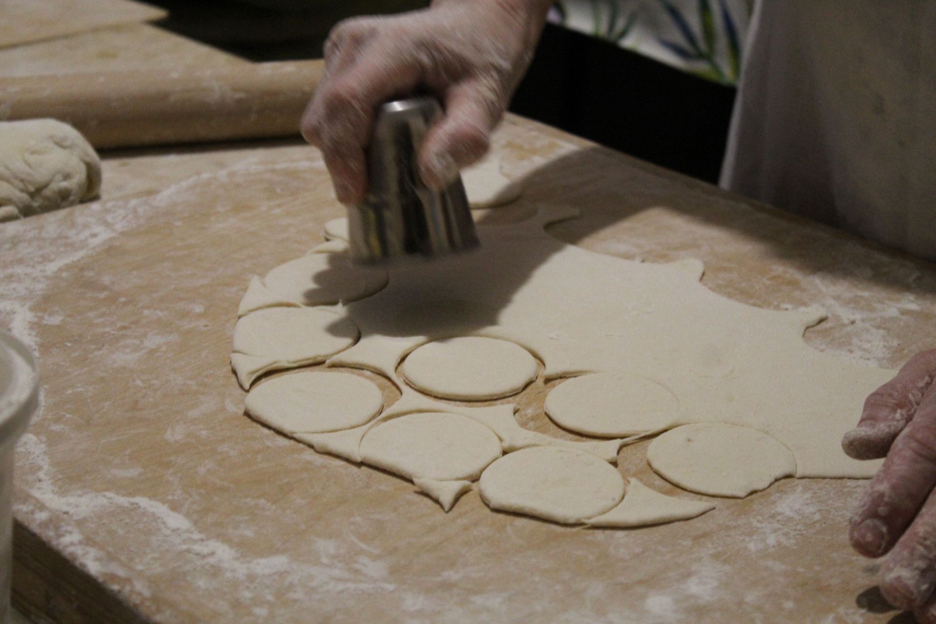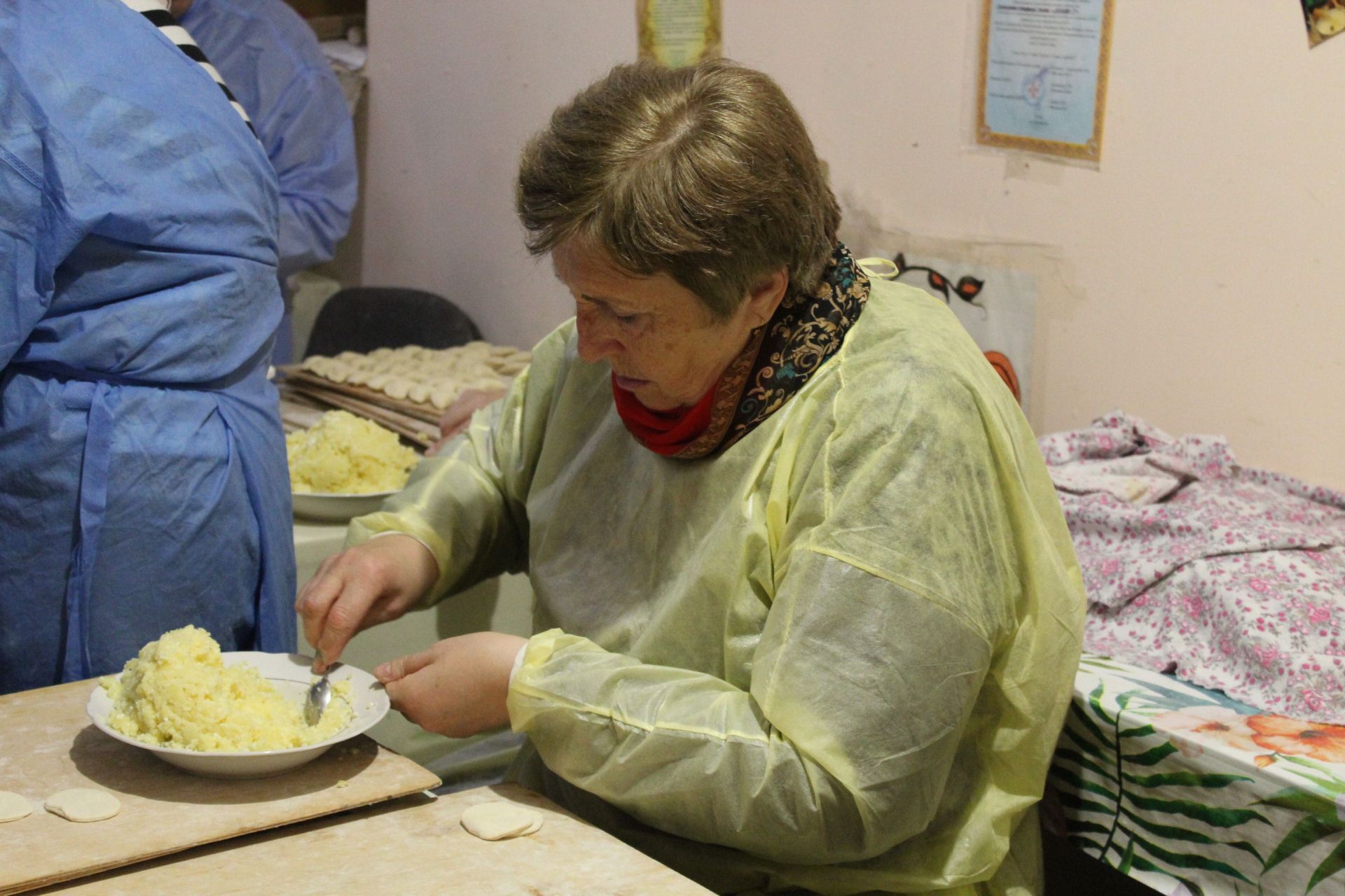– Галя у нас тут щодня. Не було такого, що вона не приходила. Ми працюємо у штабі протягом тижня, крім суботи і неділі. Збираємось на 10 годину ранку і не йдемо звідси, доки все не виконаємо – не виробимо тісто на вареники. Буває, що й до шостої вечора сидимо. Все залежить від кількості людей, які долучаються. Інколи приходили всього 7-8 осіб. Зараз закінчились польові роботи, то людей більше. Є багато переселенців: з Харківщини, Луганщини, Херсонщини тощо, – розповідає волонтерка Галина з Тернополя. Вона розкатує тісто качалкою і робить кружечки. Товаришка навпроти кладе у них начинку й зліплює вареники.
