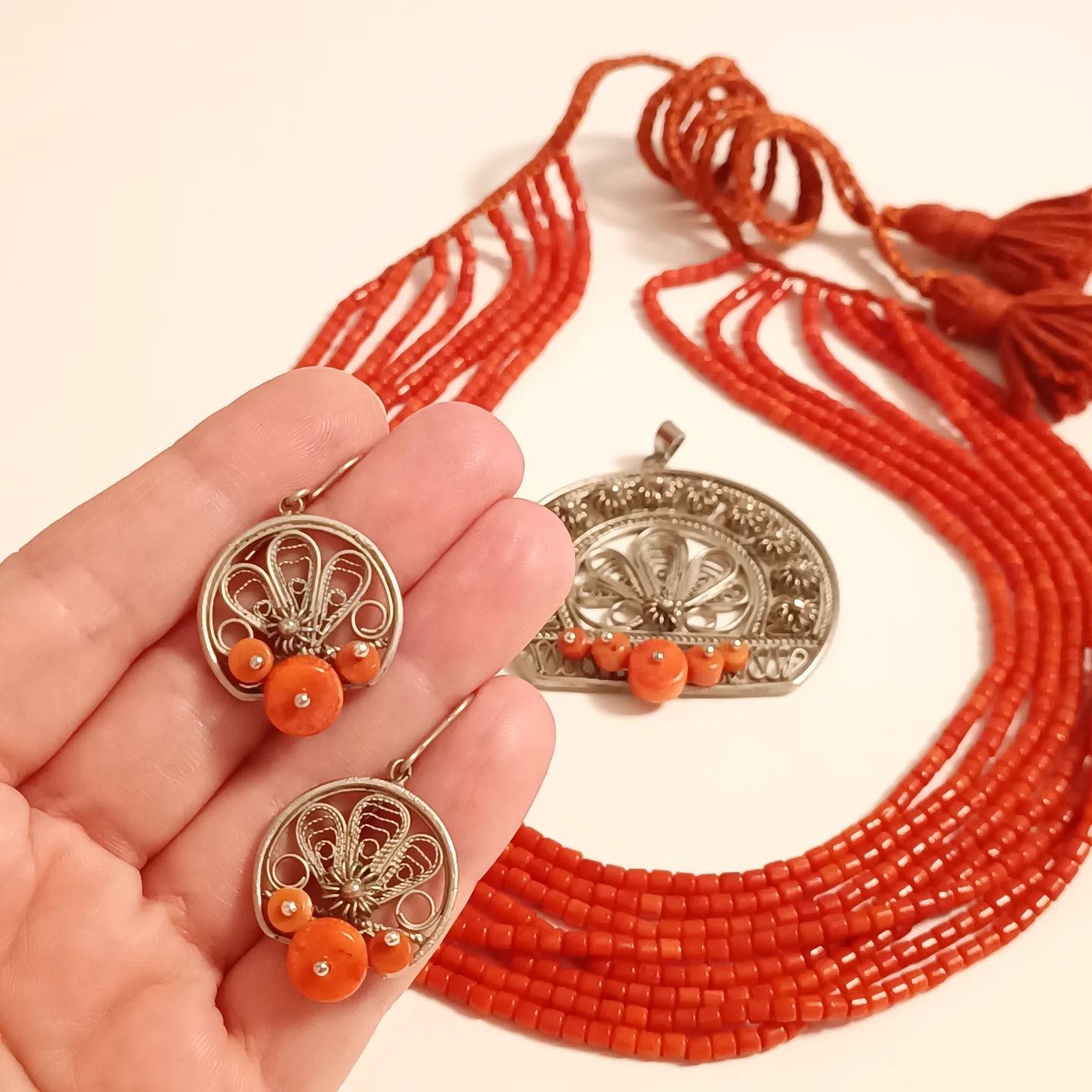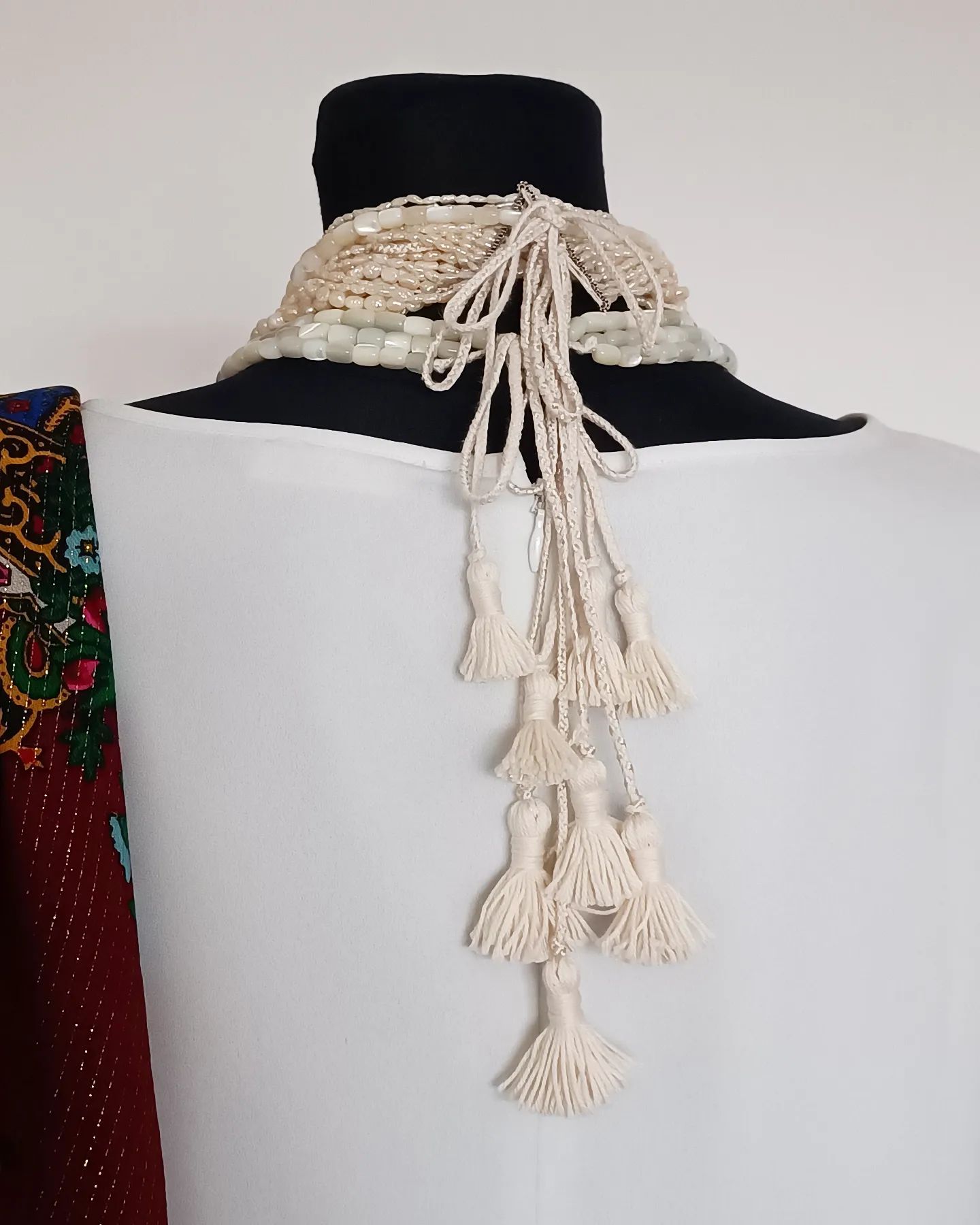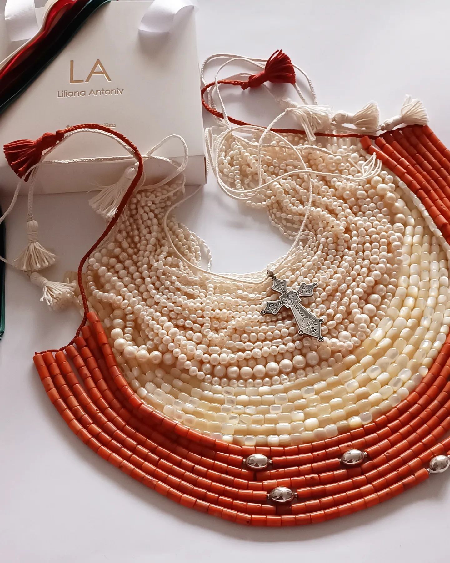 – Набір з чотирьох намист, що комбінуються між собою. Можна складати ті чи інші образи. Наприклад, перли – тут два намиста з перлин. Одне делікатніше, інше з більш крупних. Коли їх одягати разом, це щось неймовірно багате (30 разочків). Баламути ніжні і манливі. Гарно поєднуються з перлами (бажано одне намисто на 15 разків), чи з коралами. Корали крупні красиві, приємного лососевого відтінку матової текстури поєднані із срібними пуґвицями на сім достойних разків. Цю красу можна поєднати з перлами, баламутами, або ж носити самостійно. Хрест це окрема деталь, що посідає почесне місце в цьому комплекті. Крупний срібний хрест також є точною копією старовинного дукачевого хреста. Для нього спеціально сплетено бавовняний шнурочок косичкою, який можна міняти на оксамитові стрічки різних кольорів, залежно від образу, - каже вона.