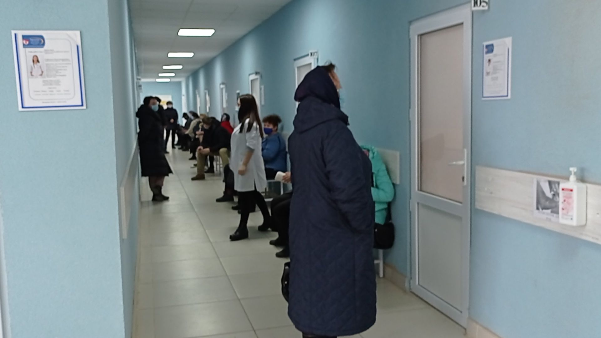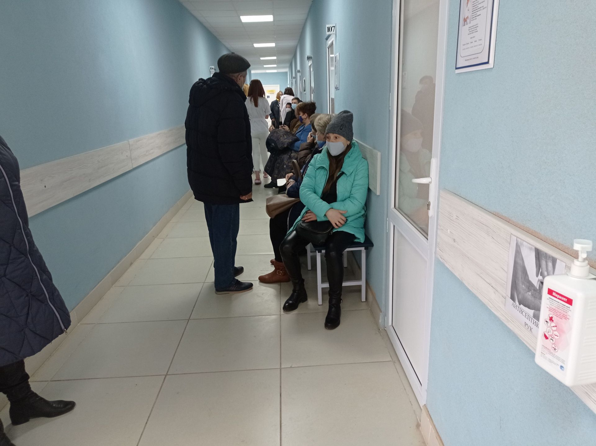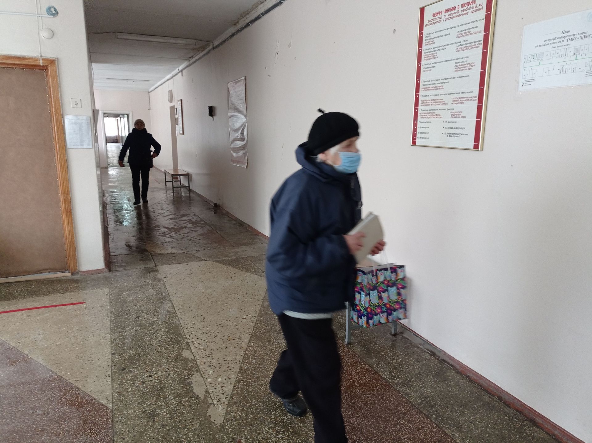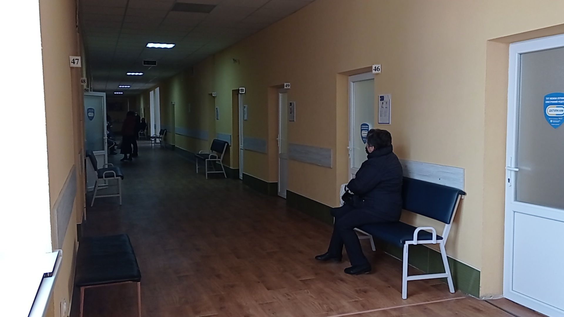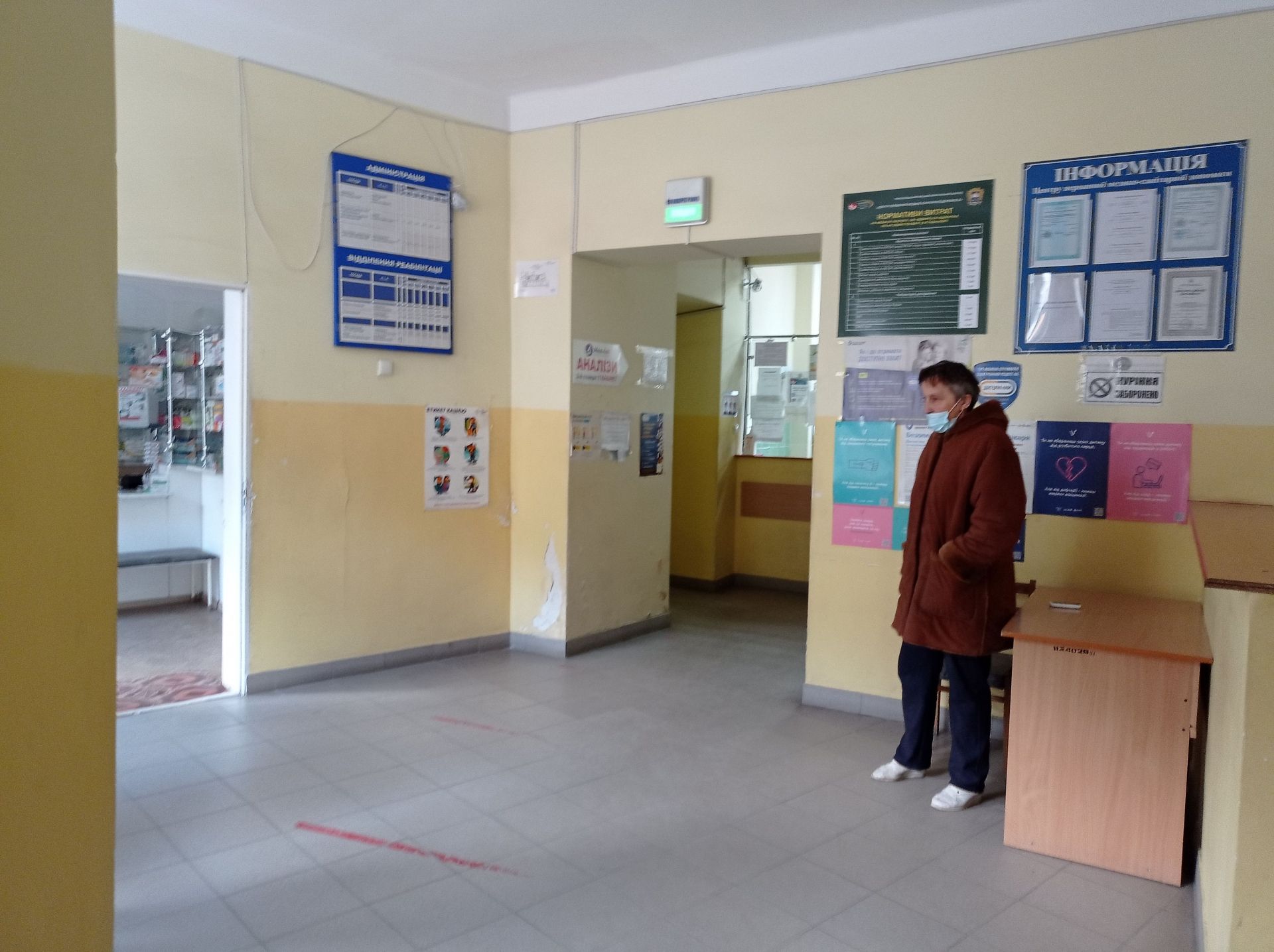 У поліклініці чисто, і людей небагато, принаймні об 11.30. Пацієнти та працівники у коридорах в масках.