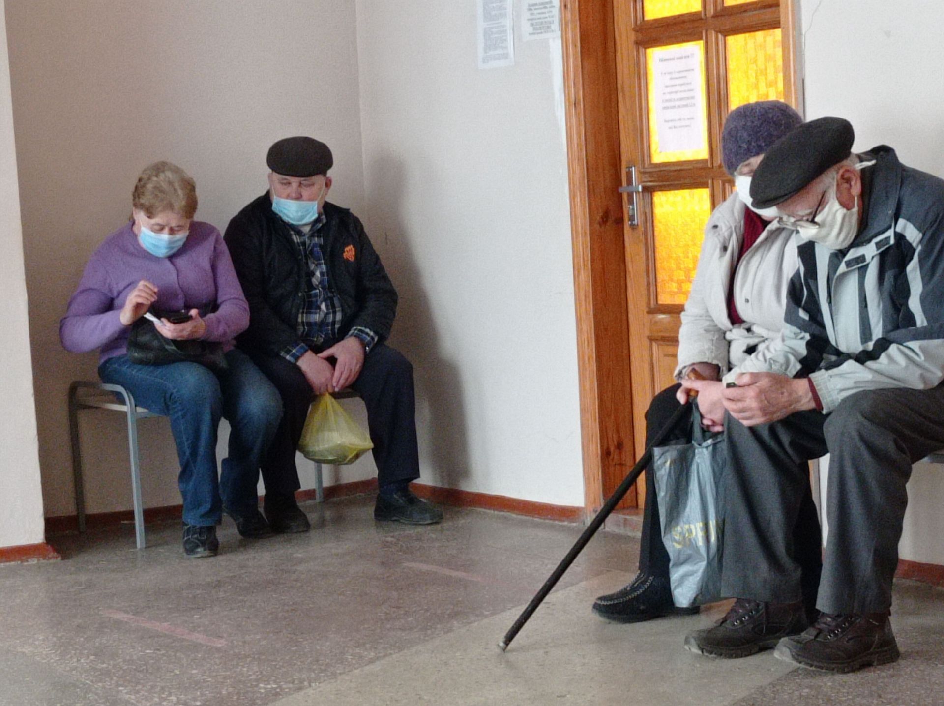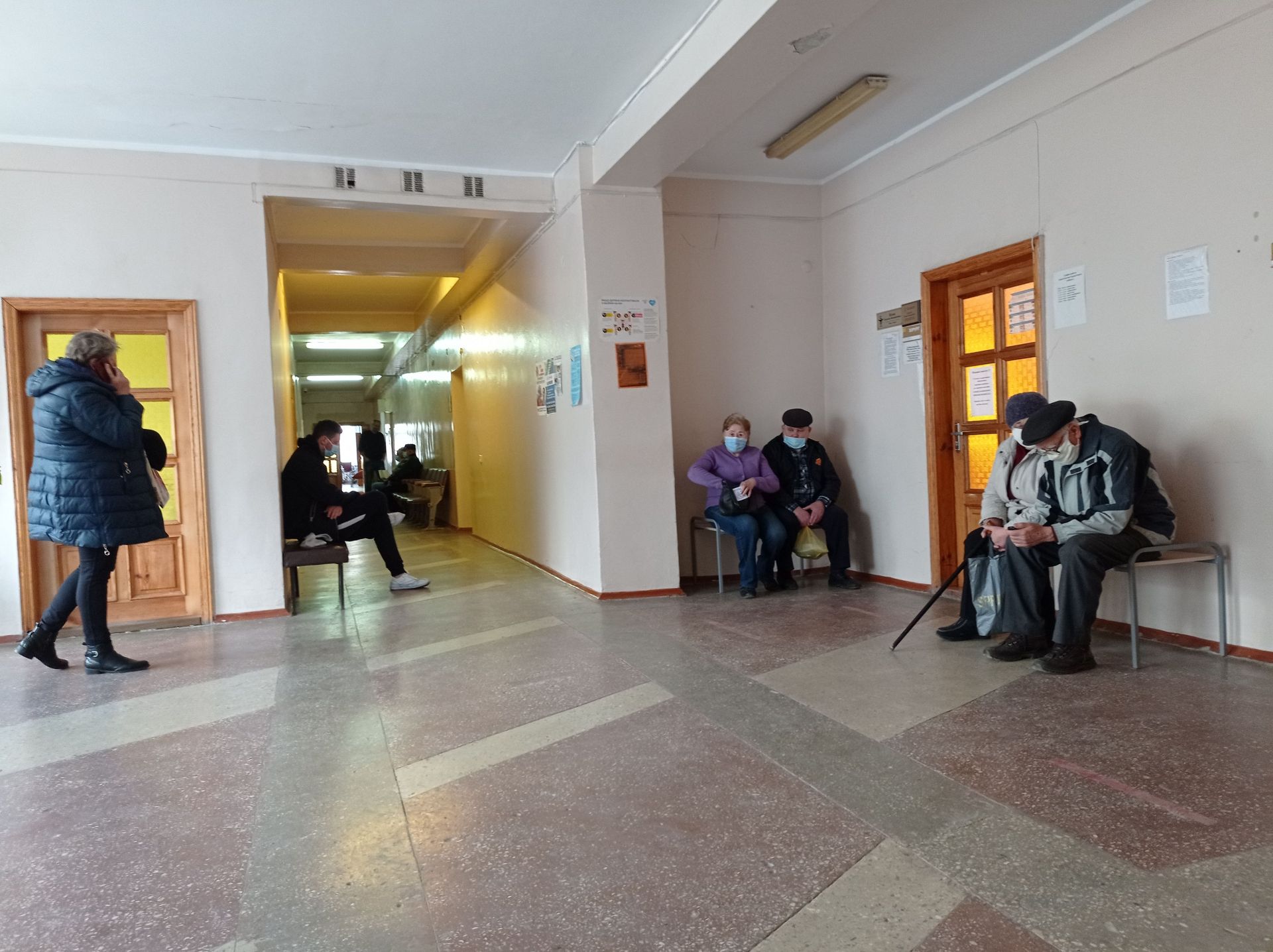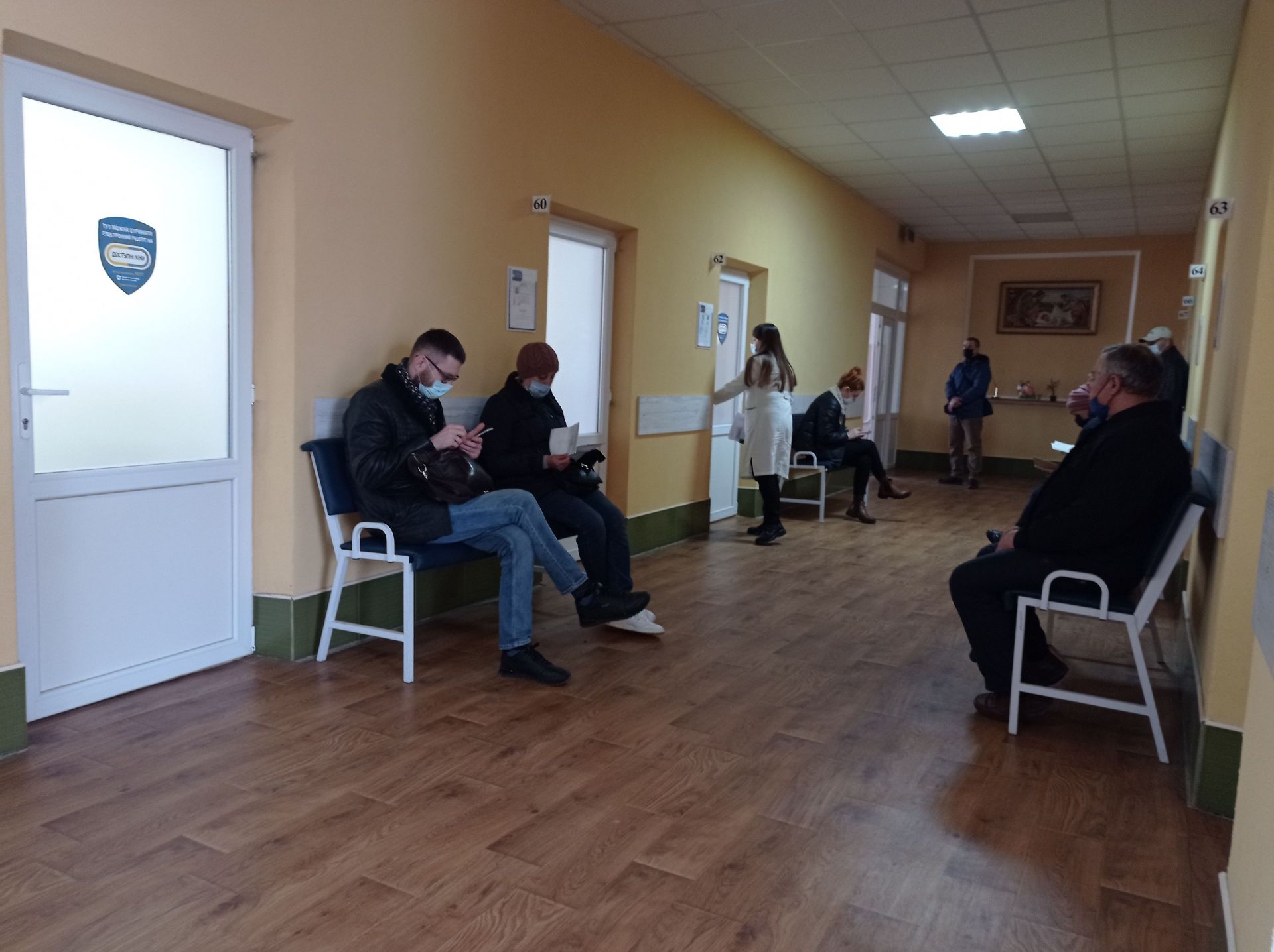 У цьому закладі людей у коридорах більше. Переважно старшого віку. Одягають маски неправильно, лише прикриваючи рот, або ж і взагалі приспускають їх на підборіддя, чекаючи в черзі.