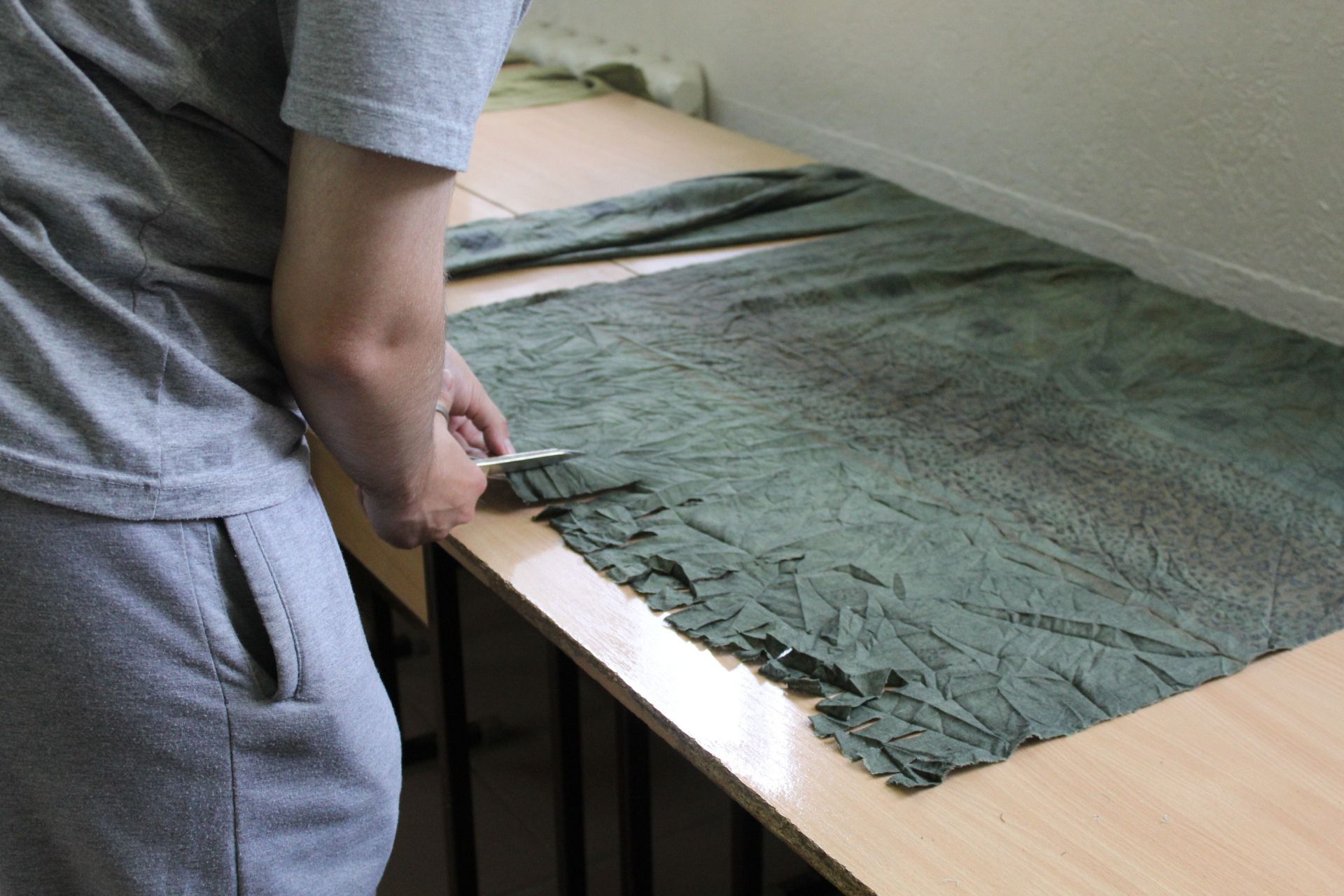 – Уродженка міста Наталія Собчак зуміла з Італії доставити сюди промислову пральну машинку. У ній ми фарбуємо тканину у шість відтінків зеленого. Як бачите, беремо звичайнісінькі простирадла. Закупити фарбу допомогла «Європейська Солідарність», – говорить Володимир Кіцак.