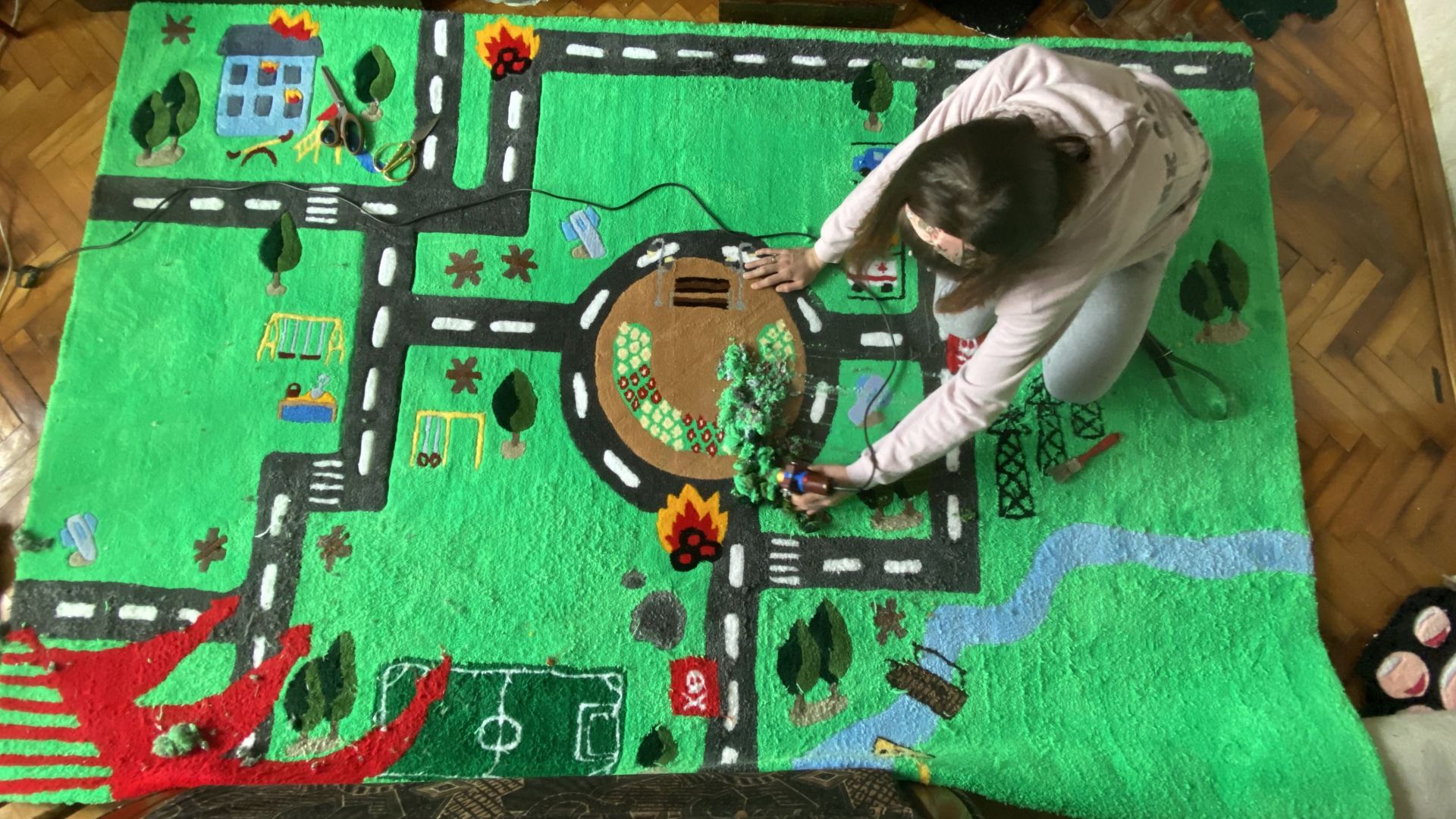 – Тоді на дерев’яну раму натягую спеціальну тканину для тафтингу. На неї через проектор наношу ескіз майбутнього килима і починаю процес вишивки. Спершу роблю контур, а тоді поступово від найменших деталей до найбільших. Опісля проклеюю килим акриловим клеєм або гідроізоляцією, аби він був міцний і не розлазився. Та це найлегші етапи роботи, – сміється Василина. – Стає важко, коли починається стрижка і контуринг. Це непросте заняття, від якого залежить зовнішній вигляд килимка. Якщо посидіти над цим 1-2 дні, можна отримати ідеальні й чіткі лінії та переходи, а виріб буде гарним та охайним. Наостанок підклеюю задню сторону, обробляю краї, чищу – і килим готовий!