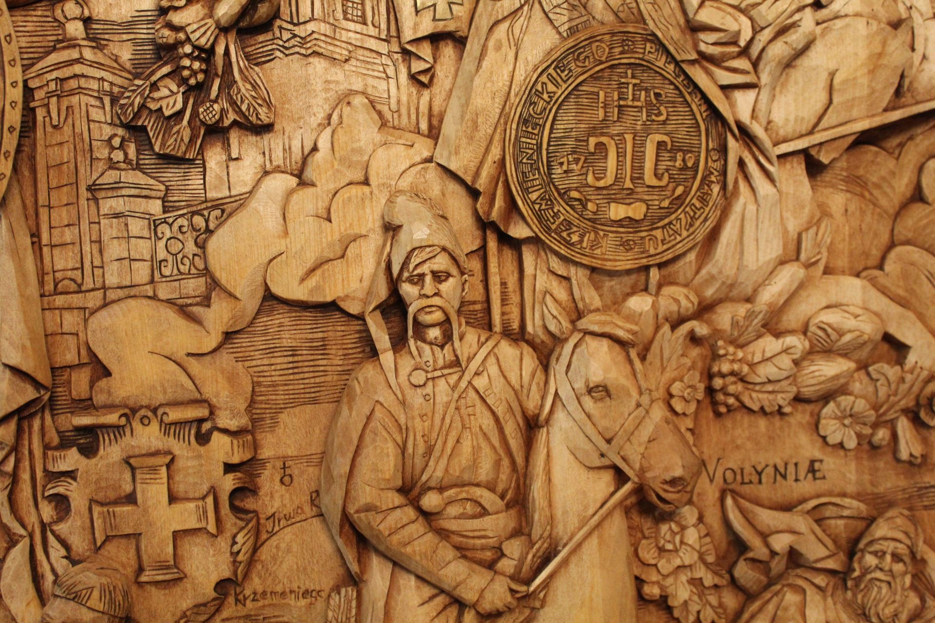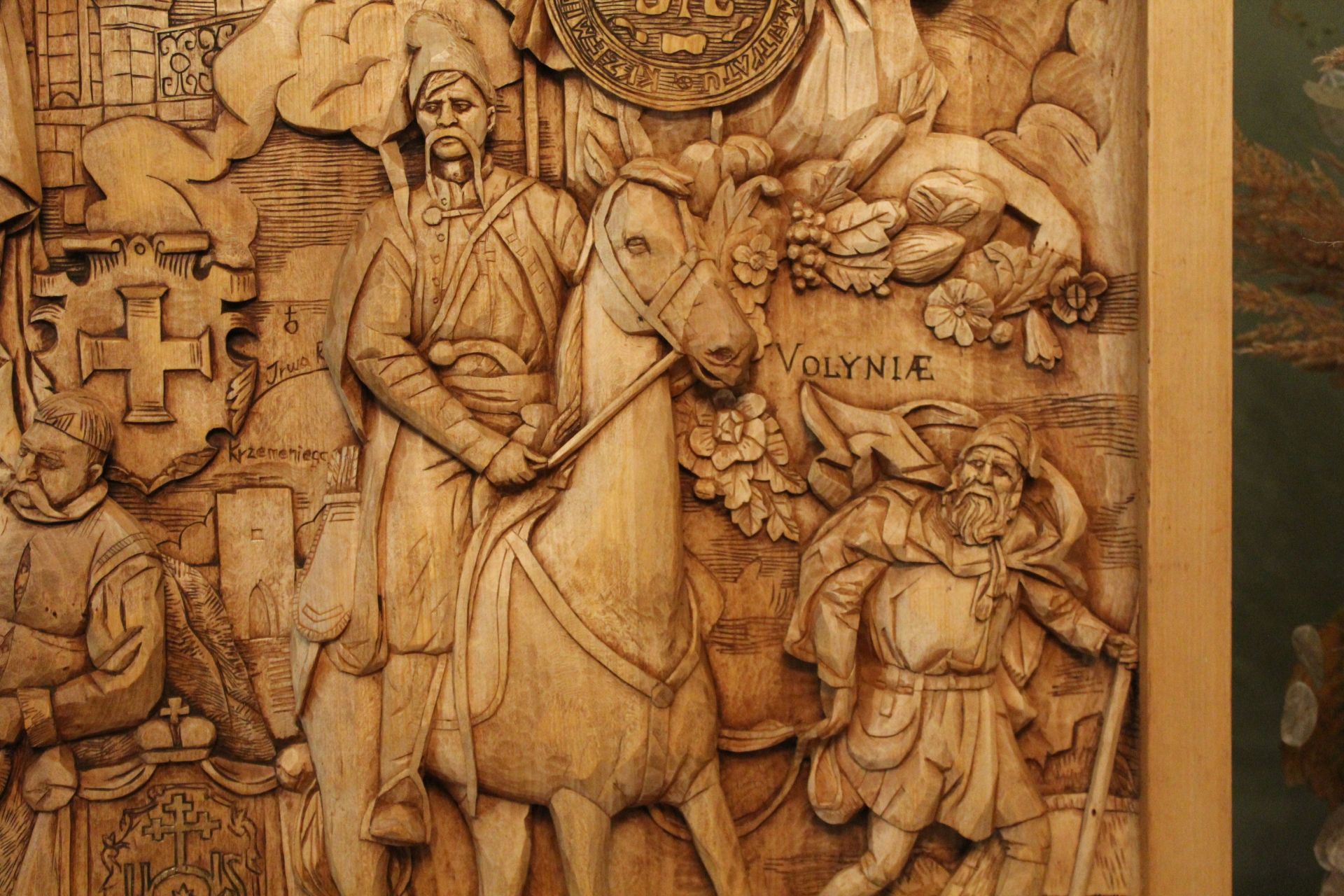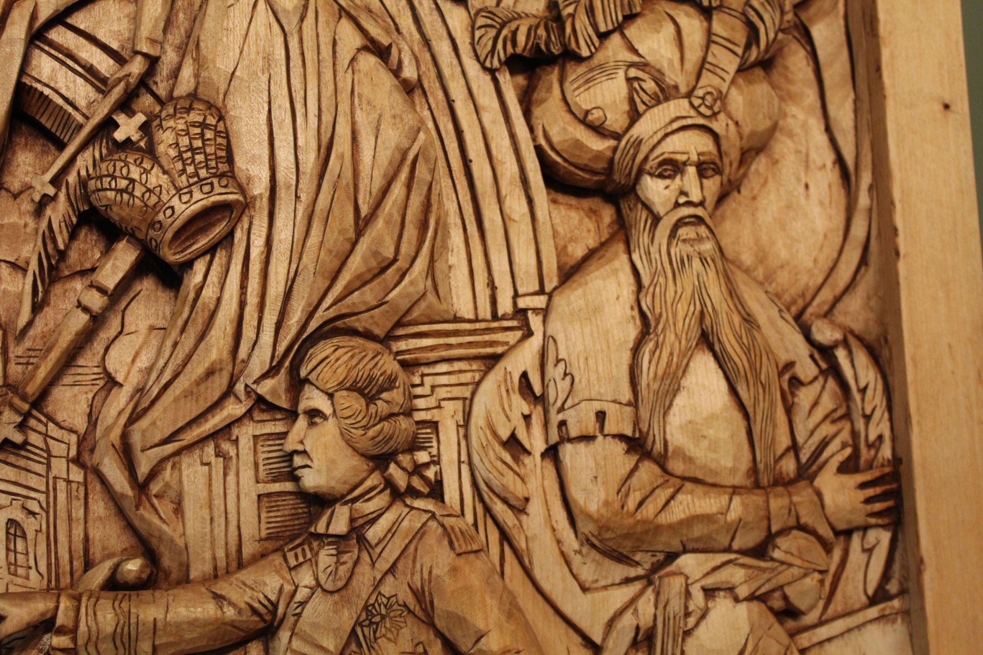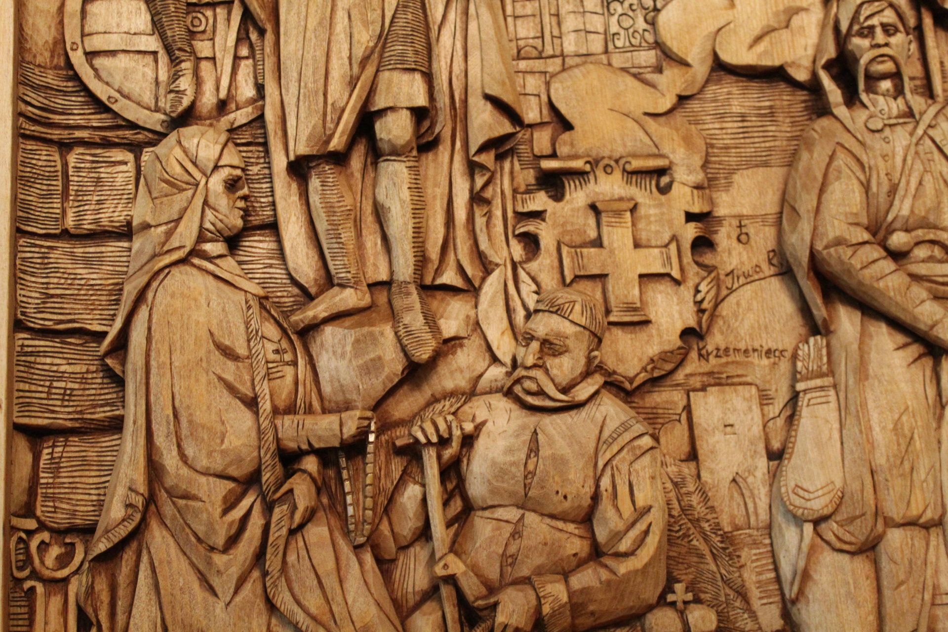 Напередодні війни у різьбяра виникла ідея створити триптих, який би поєднав події, атрибути й історичні постаті, що вплинули на сьогодення Кременця. Наразі готова тільки перша частина виробу, але вона дійсно вражає!