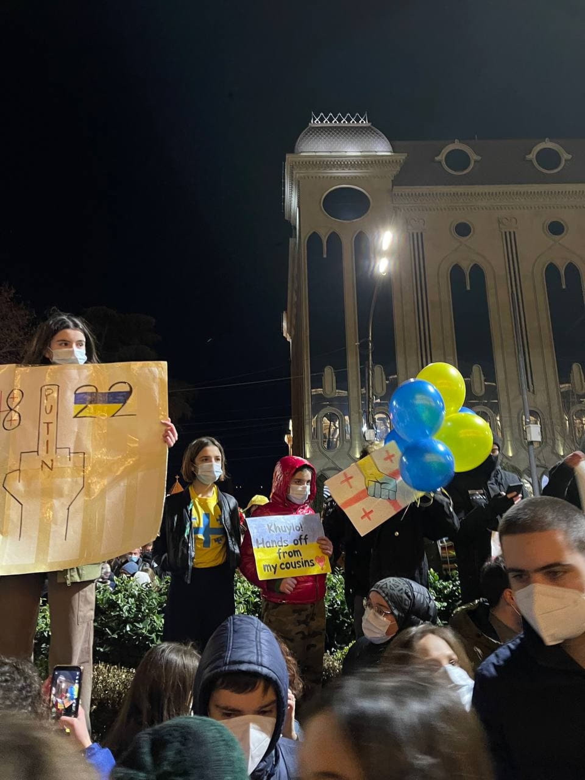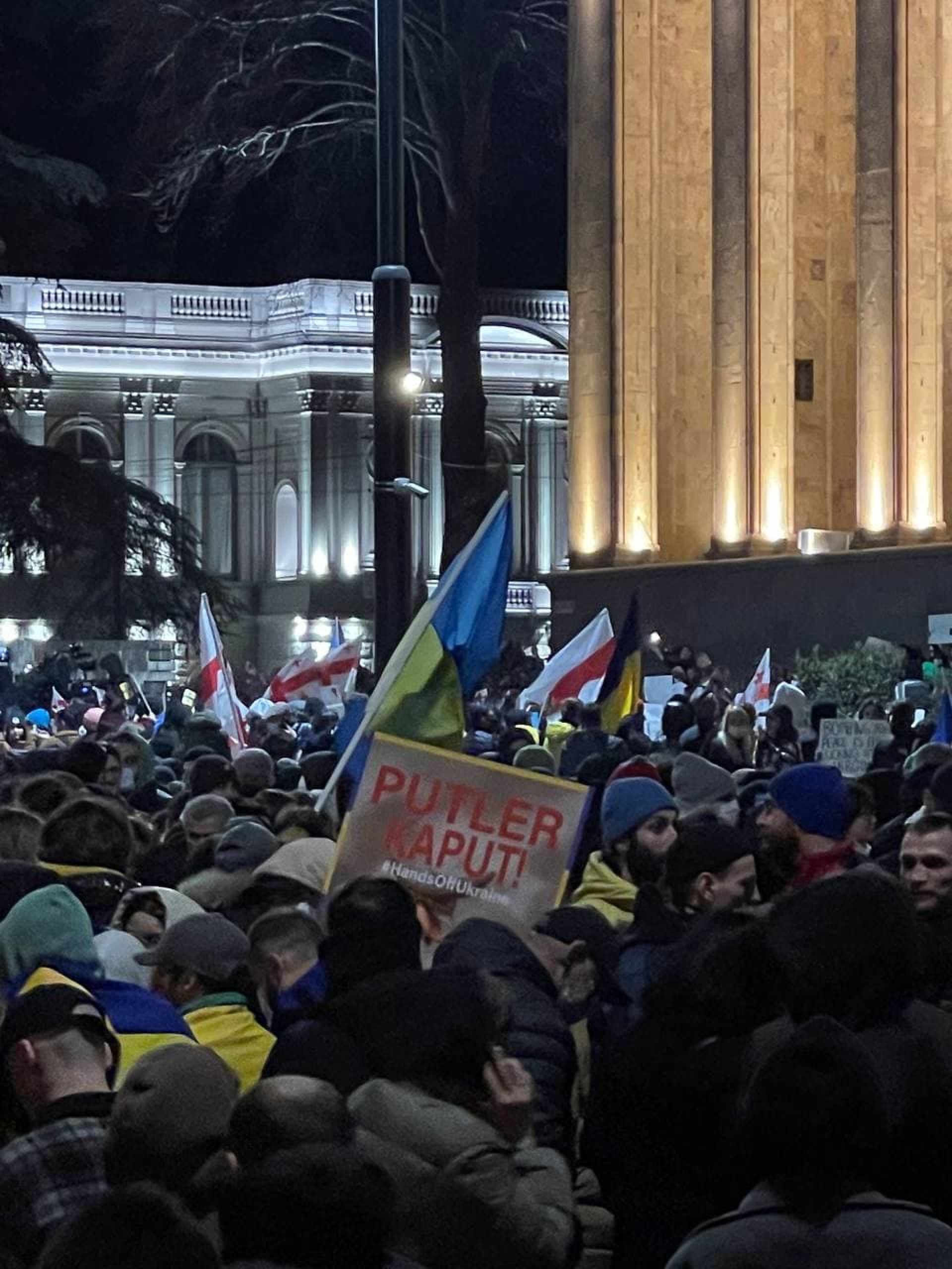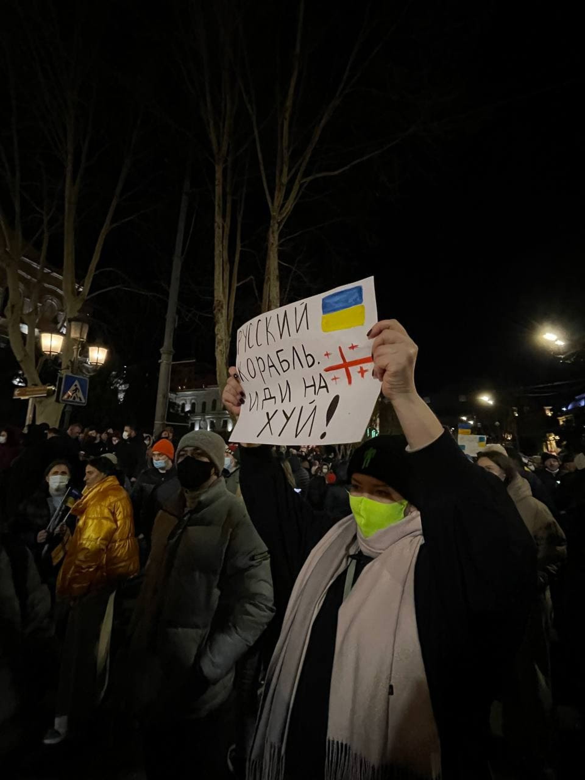 Так, на вулиці Тбілісі виходять сотні людей з Українськими прапорами та символікою, плакатами проти війни та засуджують дії РФ.