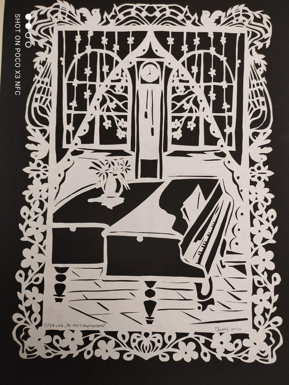 Тимчасом її зацікавленість до витинанки зростала: до рук потрапила книга із притчами, ілюстрована графічними роботами на тему козацтва. Виникло бажання скопіювати спробувала скопіювати в улюбленій техніці. Пригадує, як витинала ножичками з блакитного паперу.