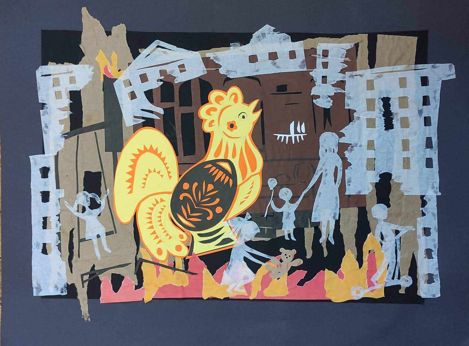 Воєнна тематика виокремлюється підходами: тут і вирізки з газет, і елементи колажів. Змістовою наповненістю ці роботи підкреслюють біль.