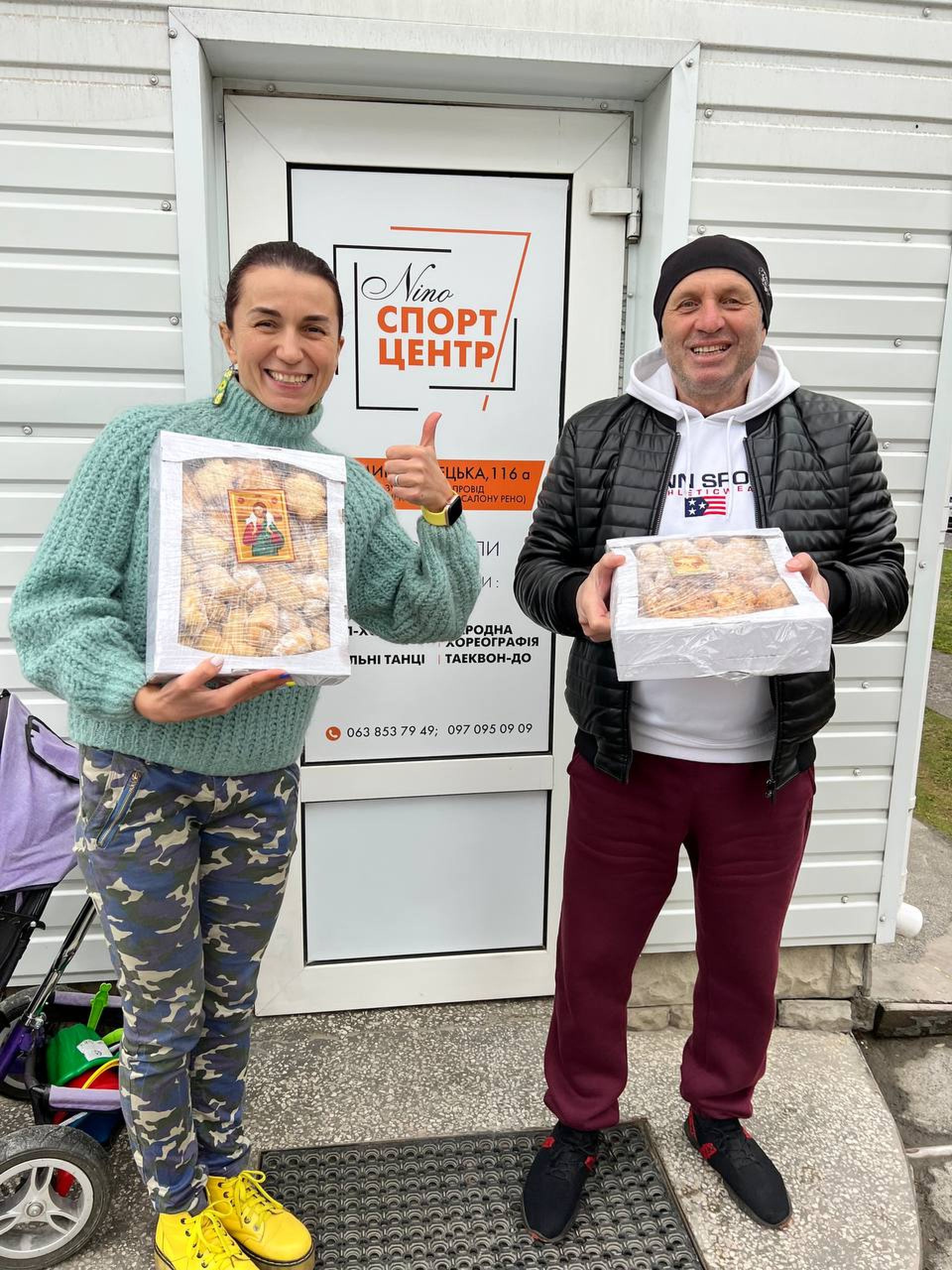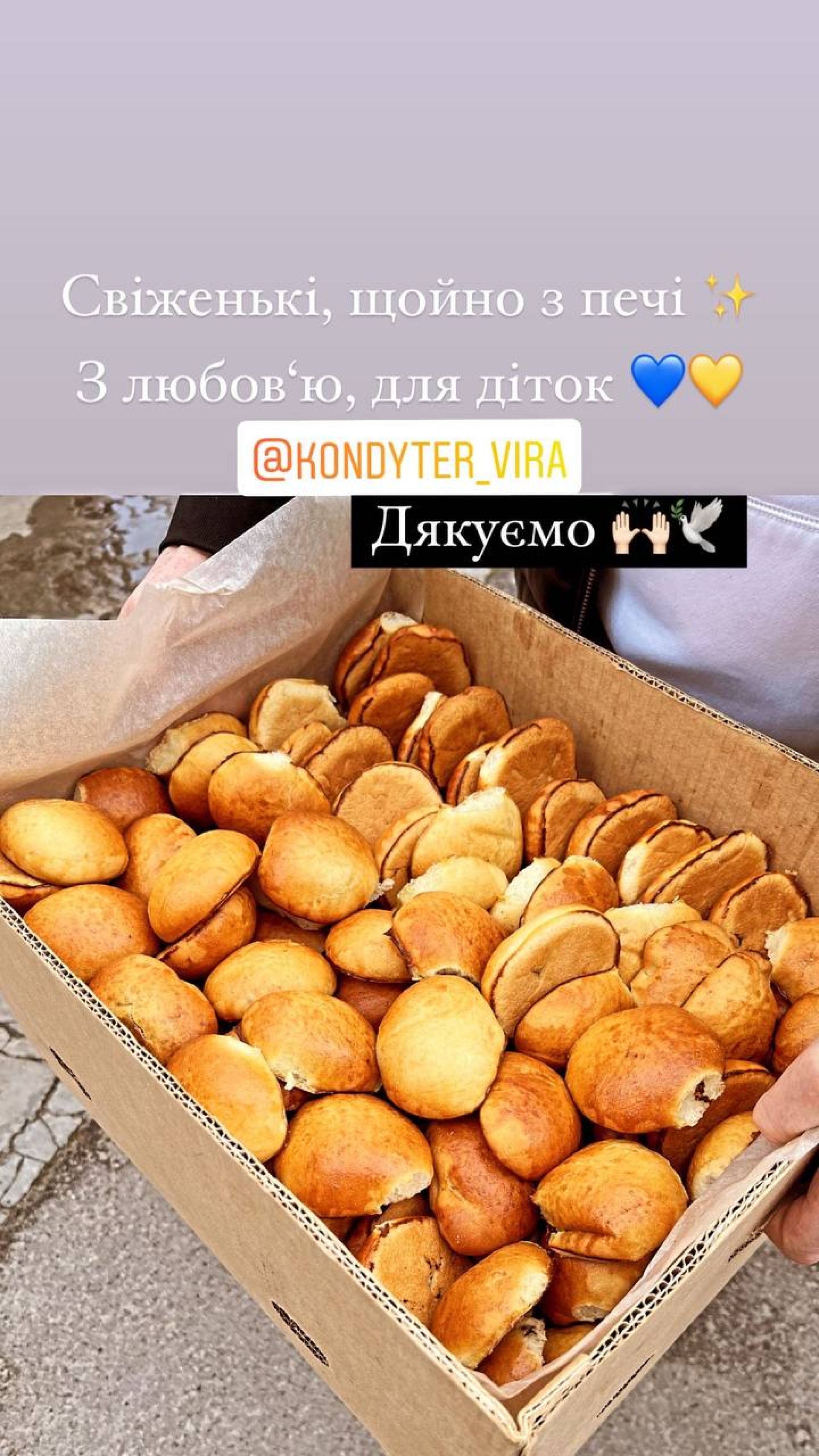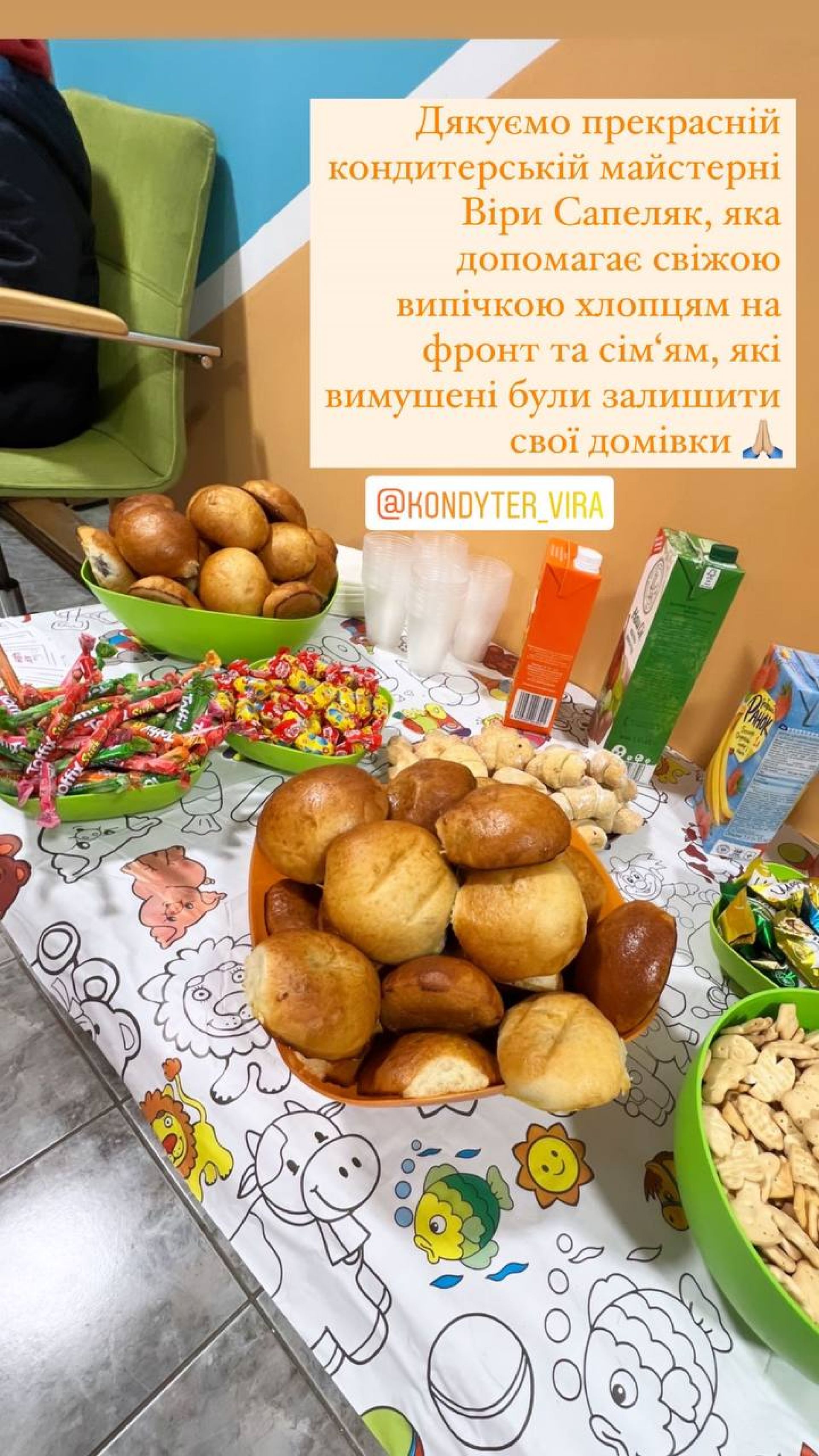 Долучилась моя знайома з кондитерської майстерні Іри Сапеляк. Її звуть Маша і вона постійно привозила до прихистку випічку, яку ми передавали хлопцям на фронт і пригощали переселенців. Маша напекла для дітей різних тістечок, рогаликів, печива. Ми організували свято для малечі…