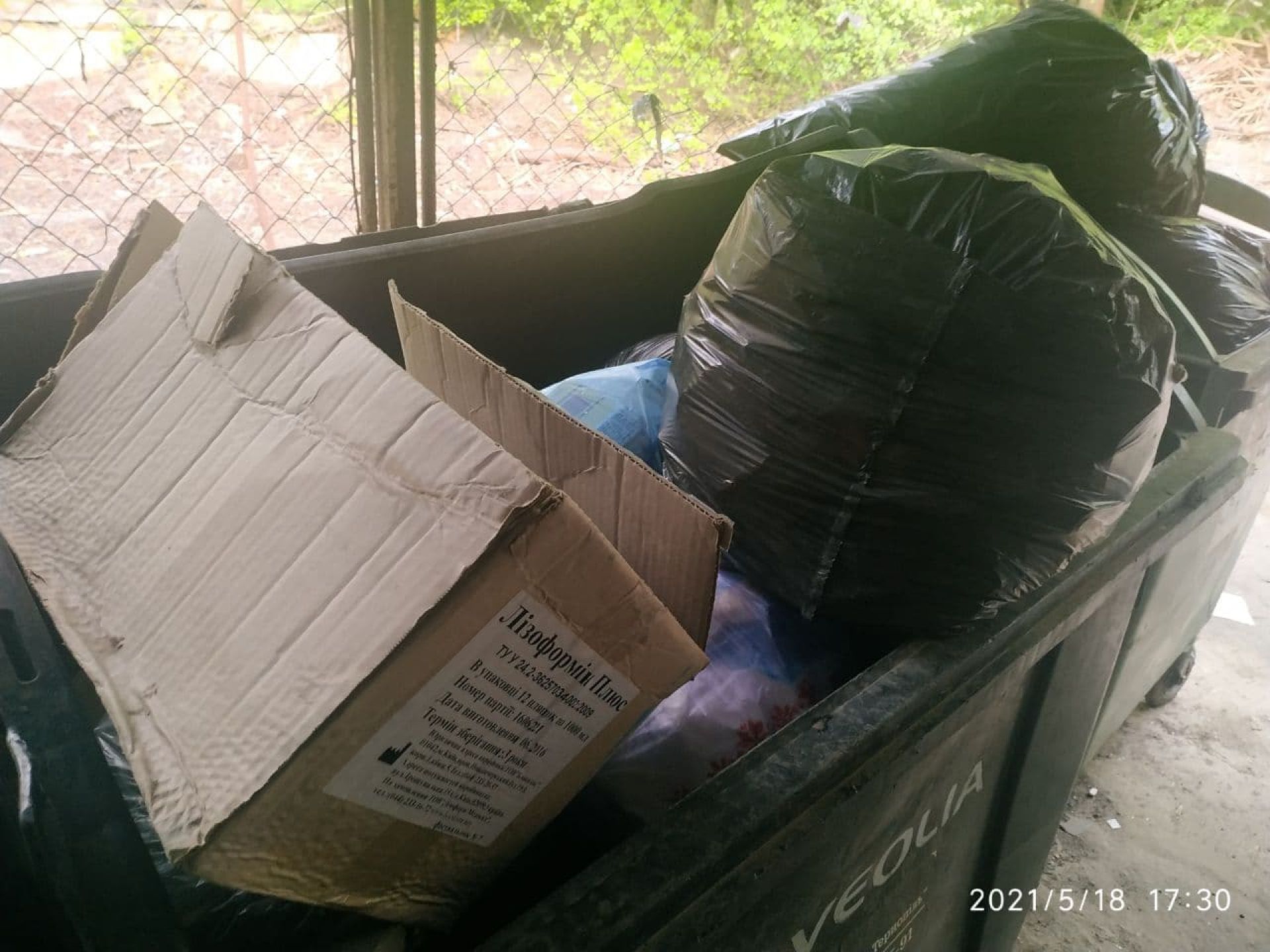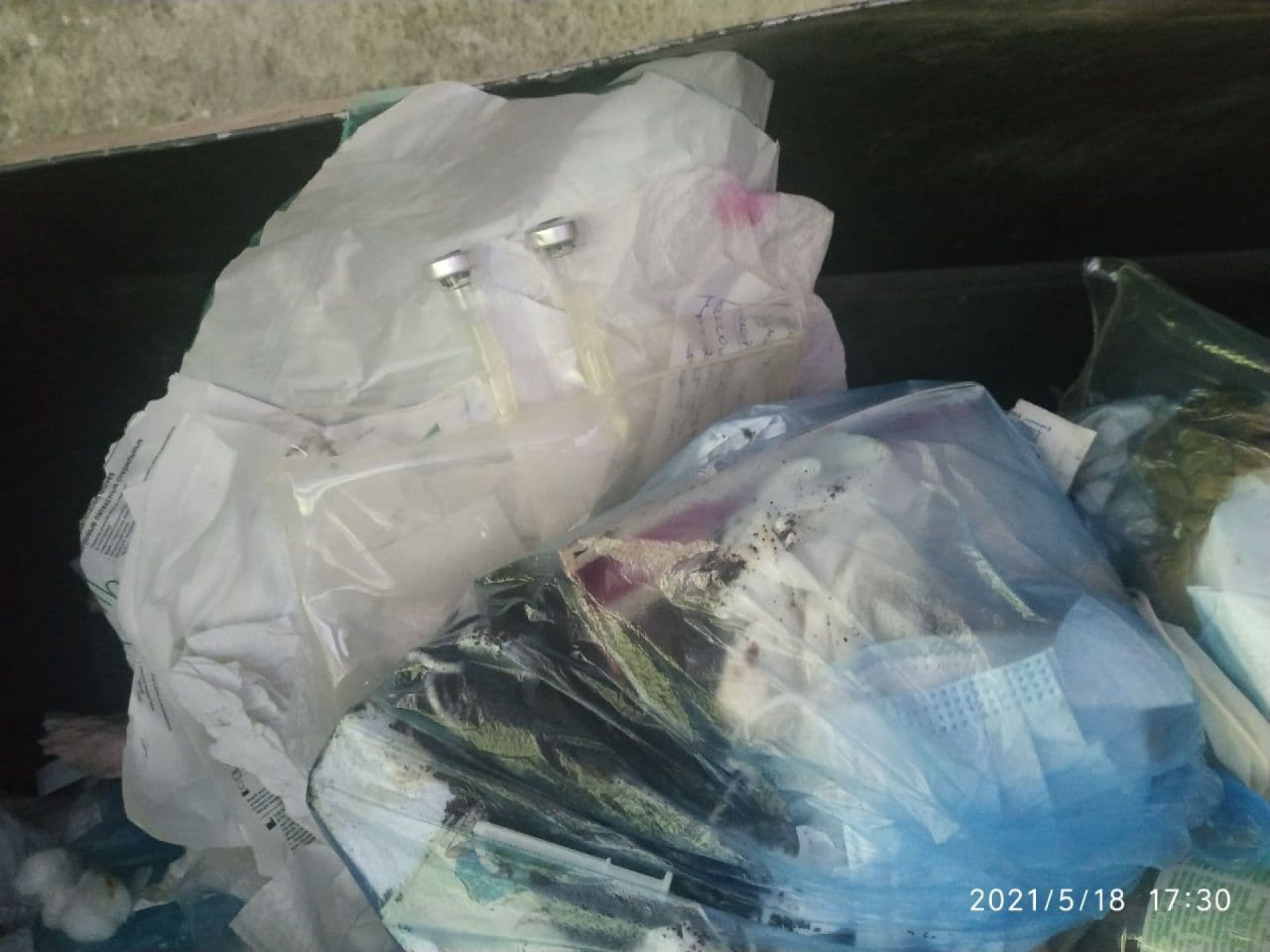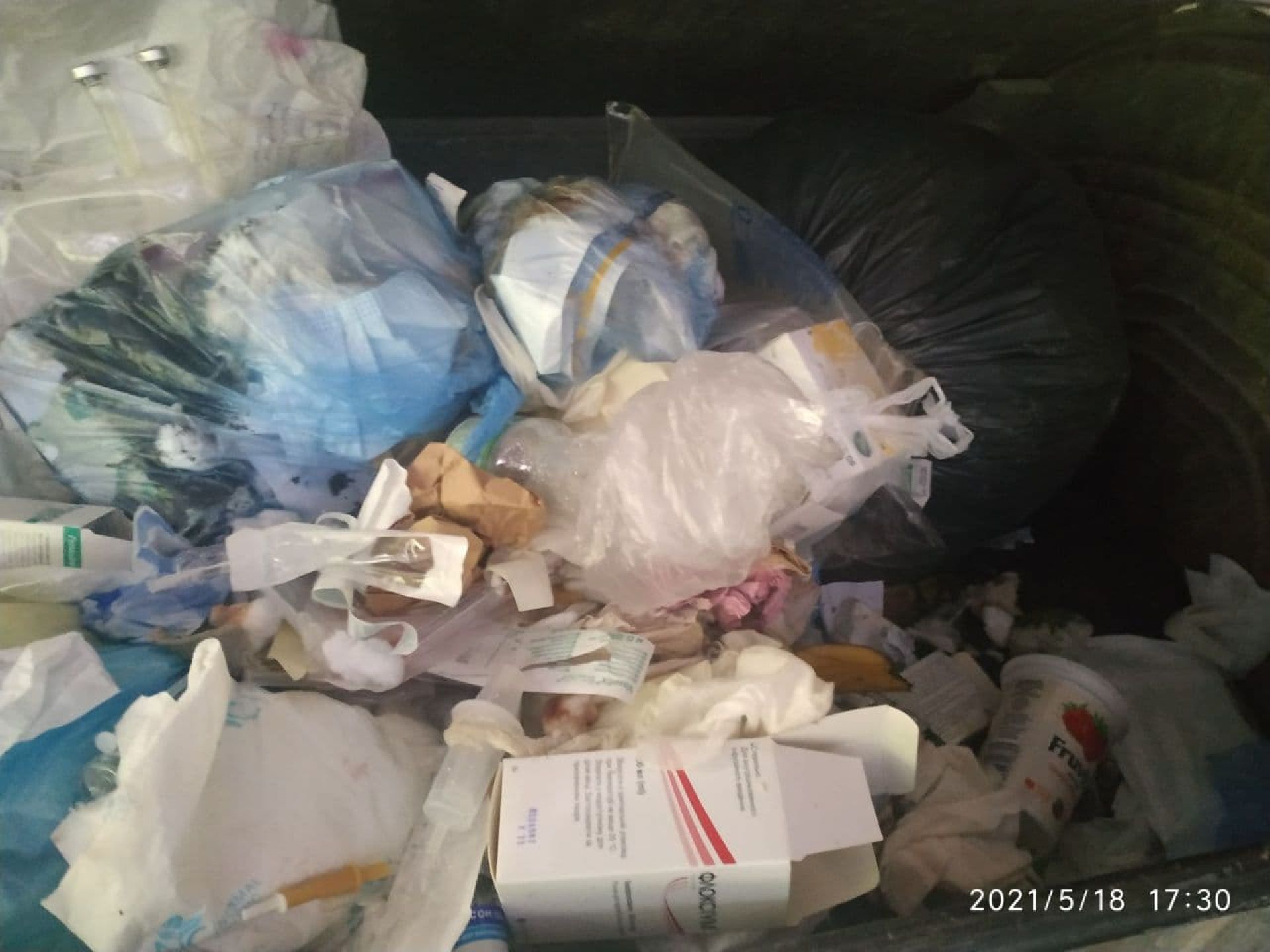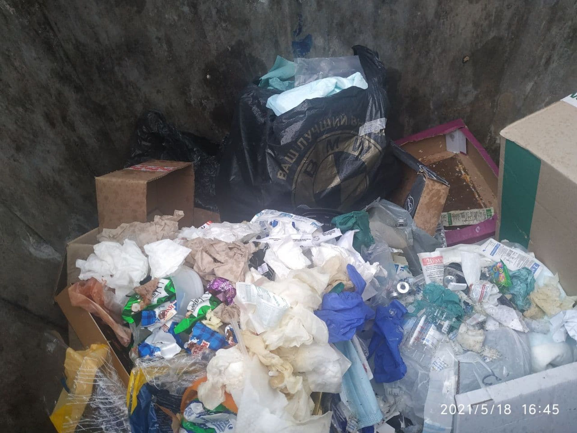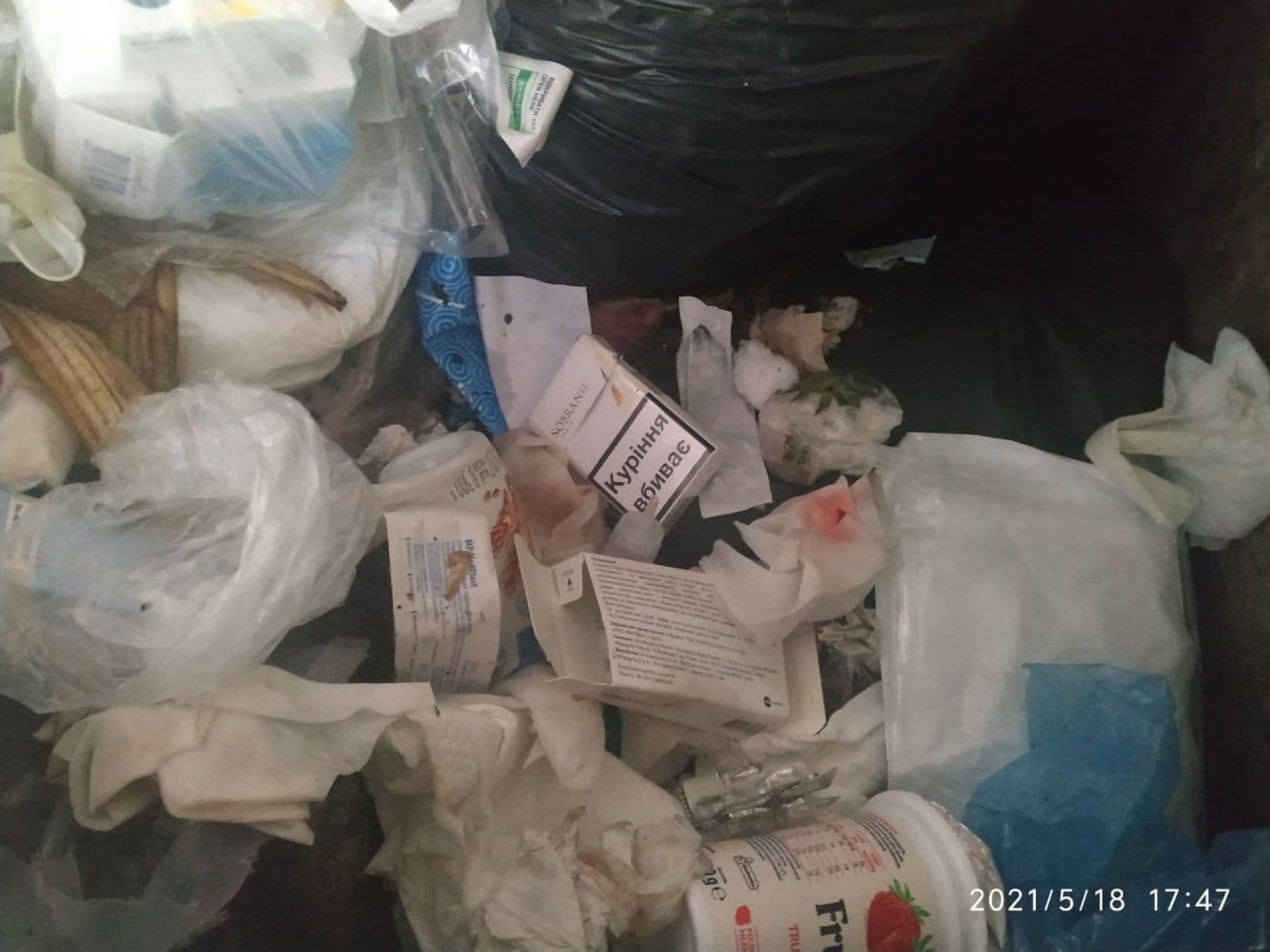 У сміттєвих баках, окрім побутових відходів були і використані маски, рукавички, крапельниці, але без голок, а також ватні диски та вата, на якій залишилася кров.