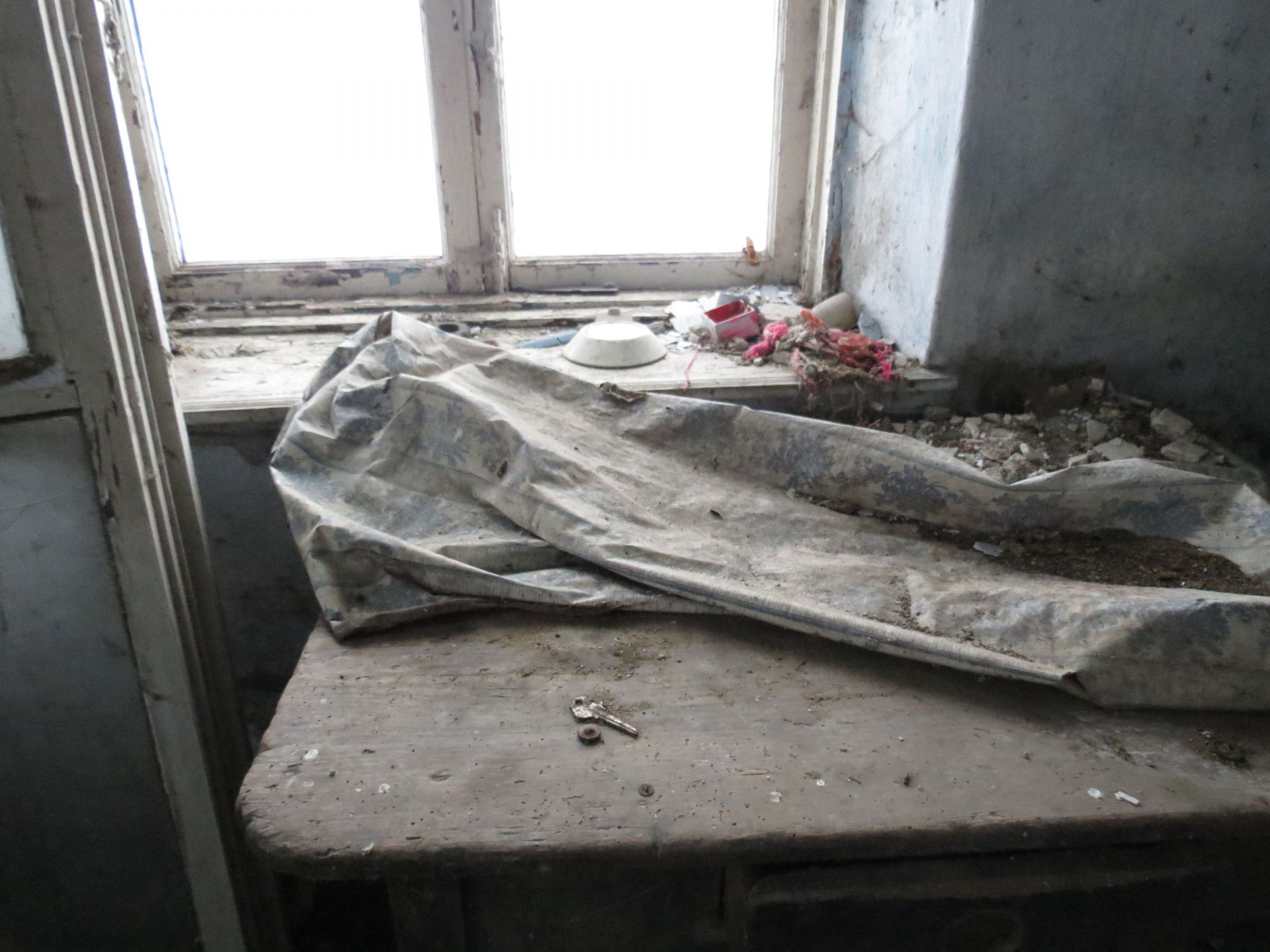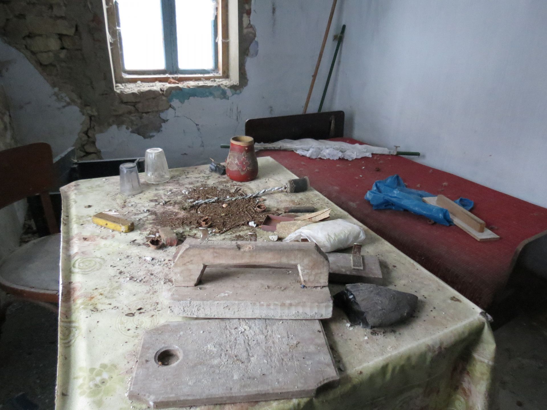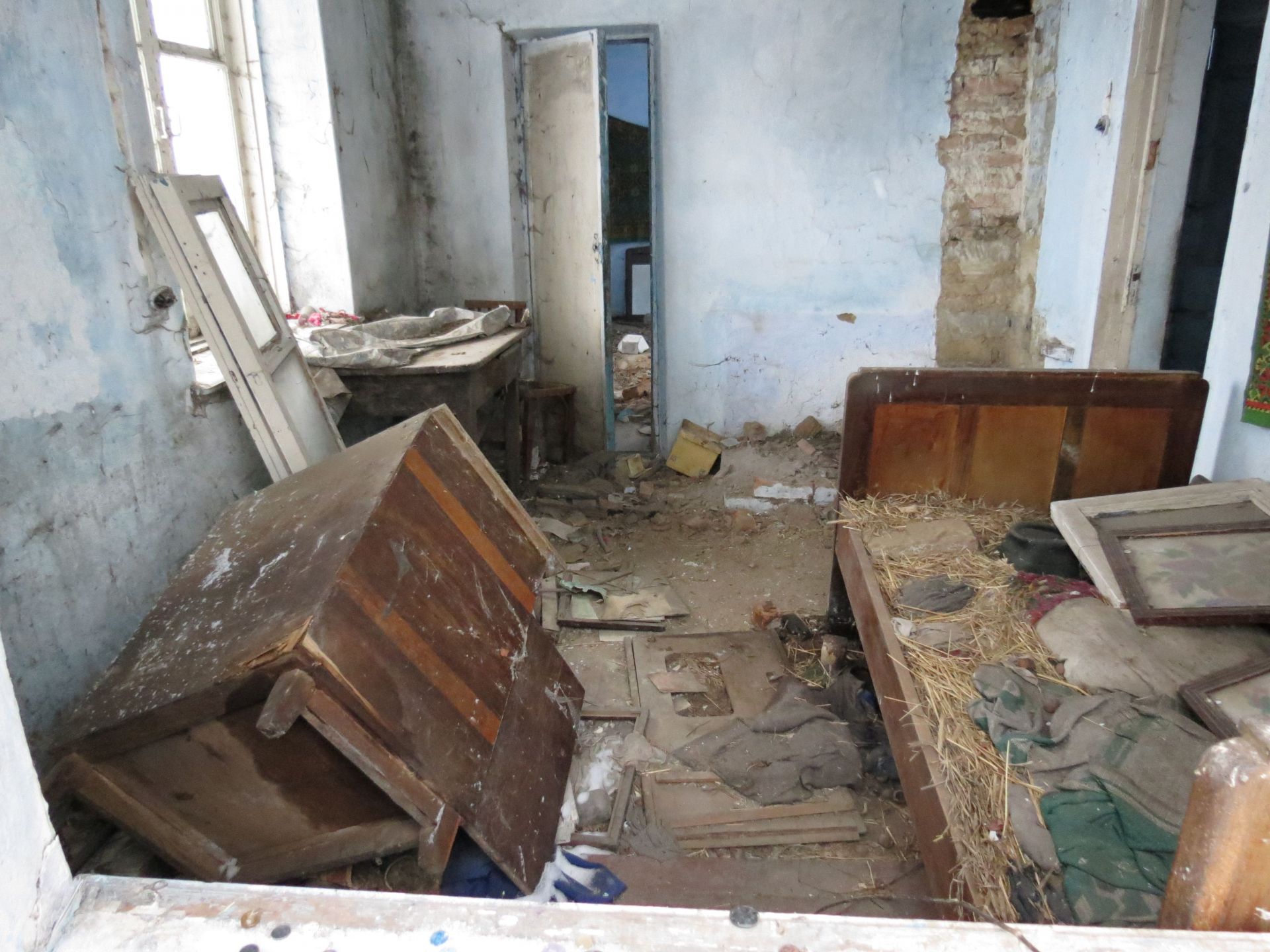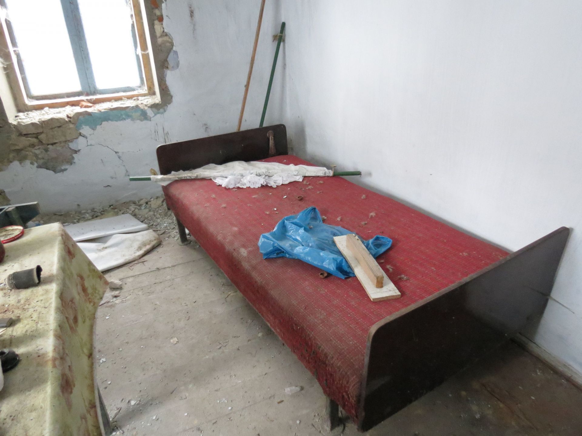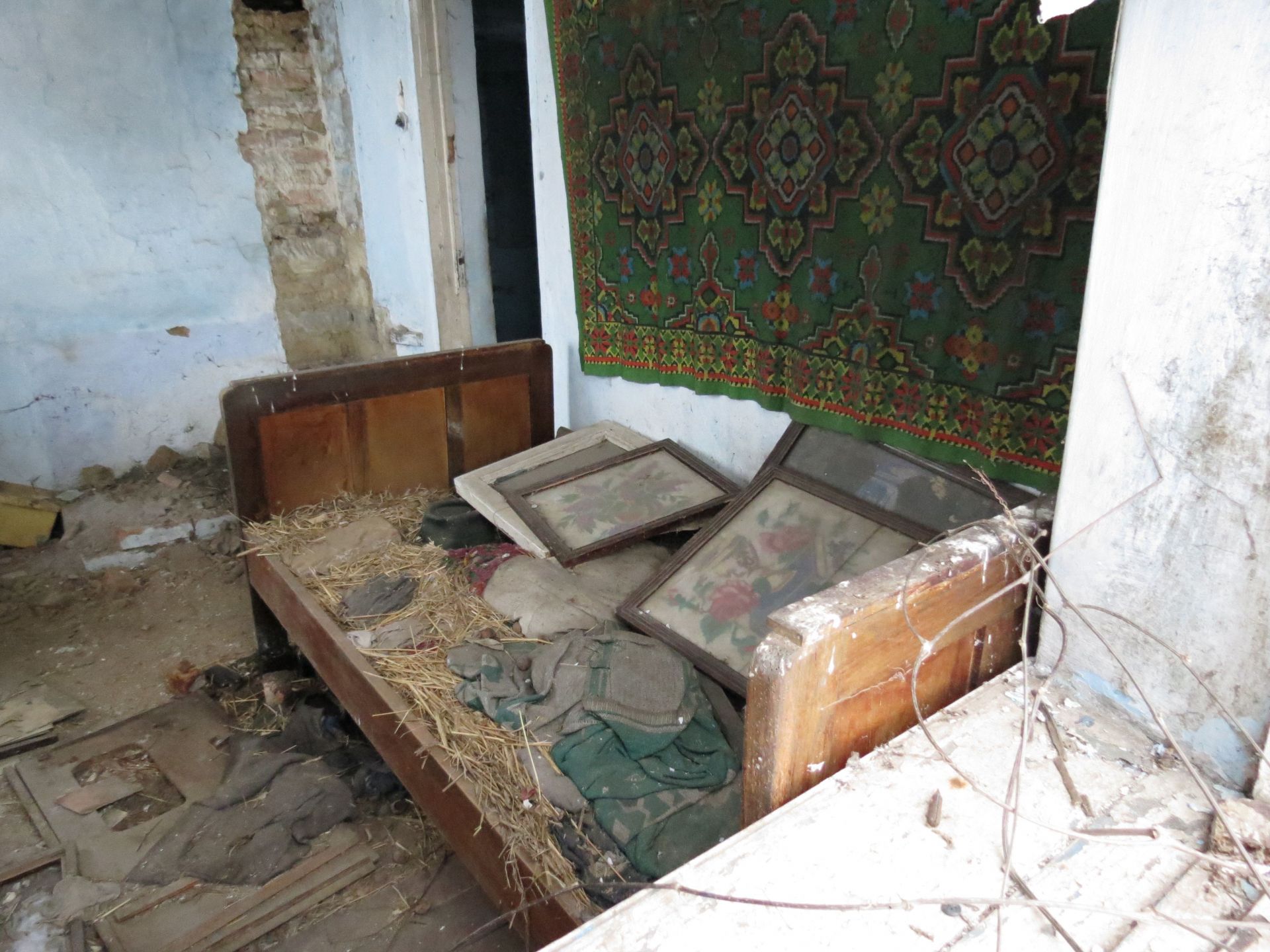 У третьому будинку лишилося навіть ліжко та стіл зі скатертиною, як спогад, що хтось тут жив. Стіни цієї оселі вже потроху тріскаються та осипаються. У великій кімнаті є три великих ікони з Ісусом та Божою Матір’ю, які дивляться на всіх, хто заходить в помешкання. А ще тут ми також знайшли стару фотографію з двома дітками. Вона також лежала поміж сміття і бруду, але виявилася кольоровою.