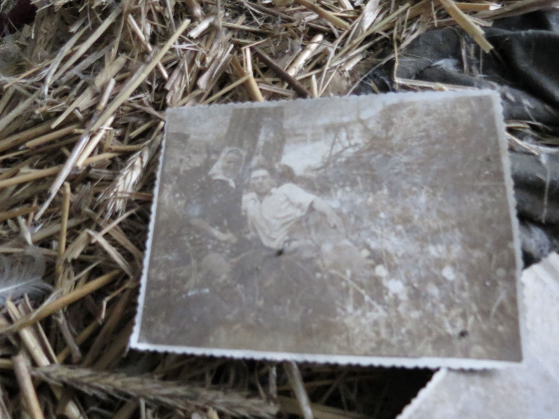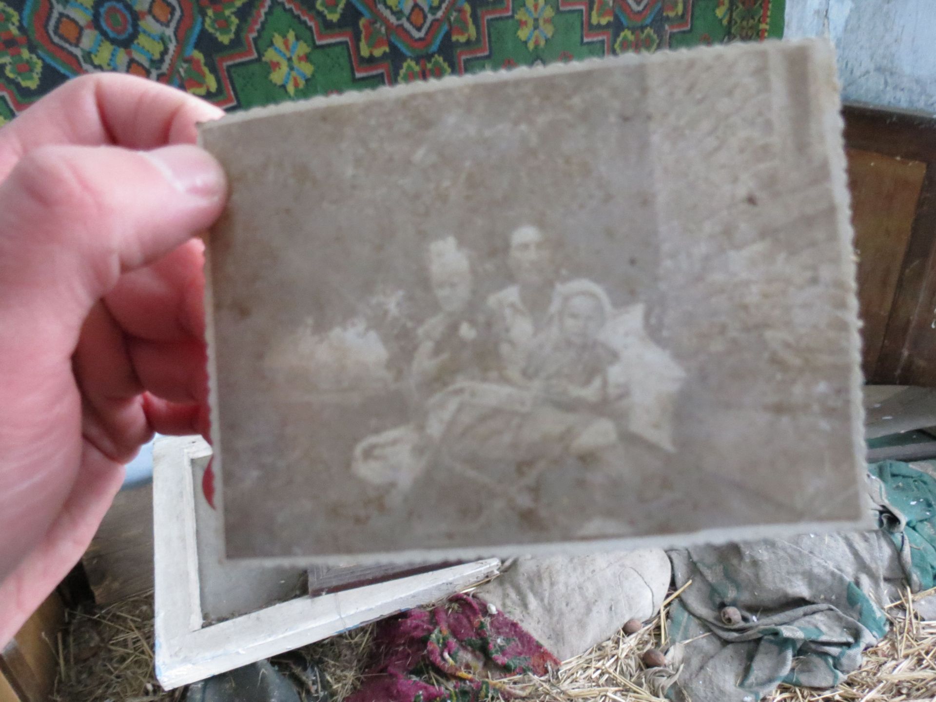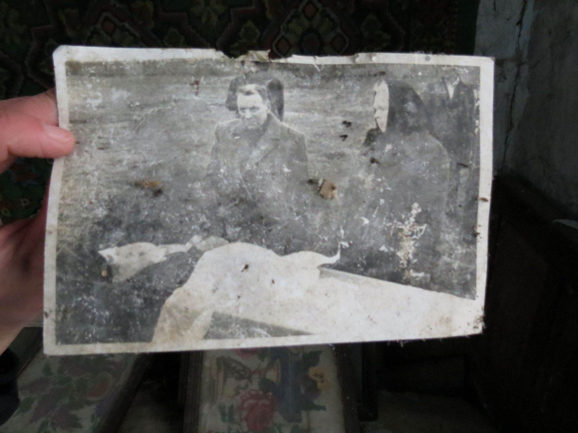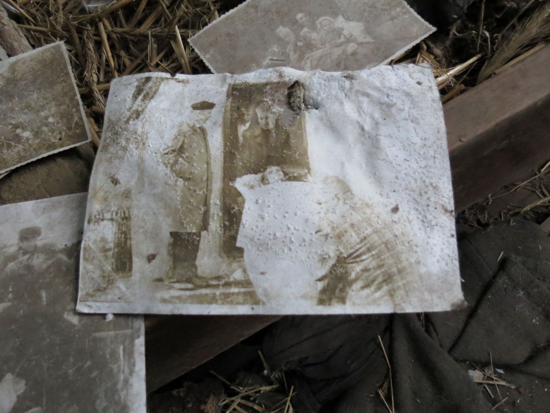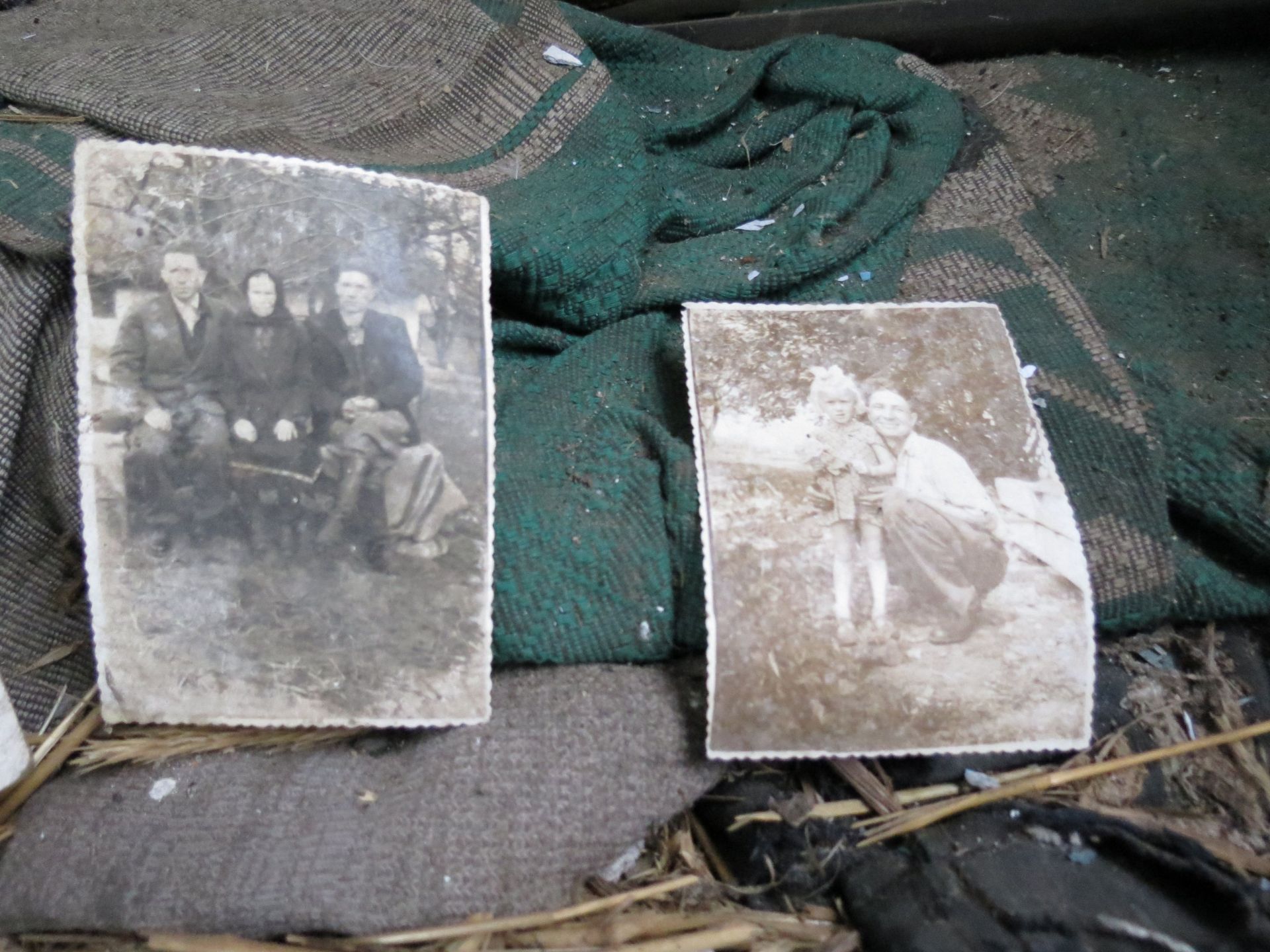 Всередині оселі лишилися старі меблі, коври на стінах і… фотографії. Порвані, розсипані на підлозі зі старими листівками та листками з книг, але це фотографії!