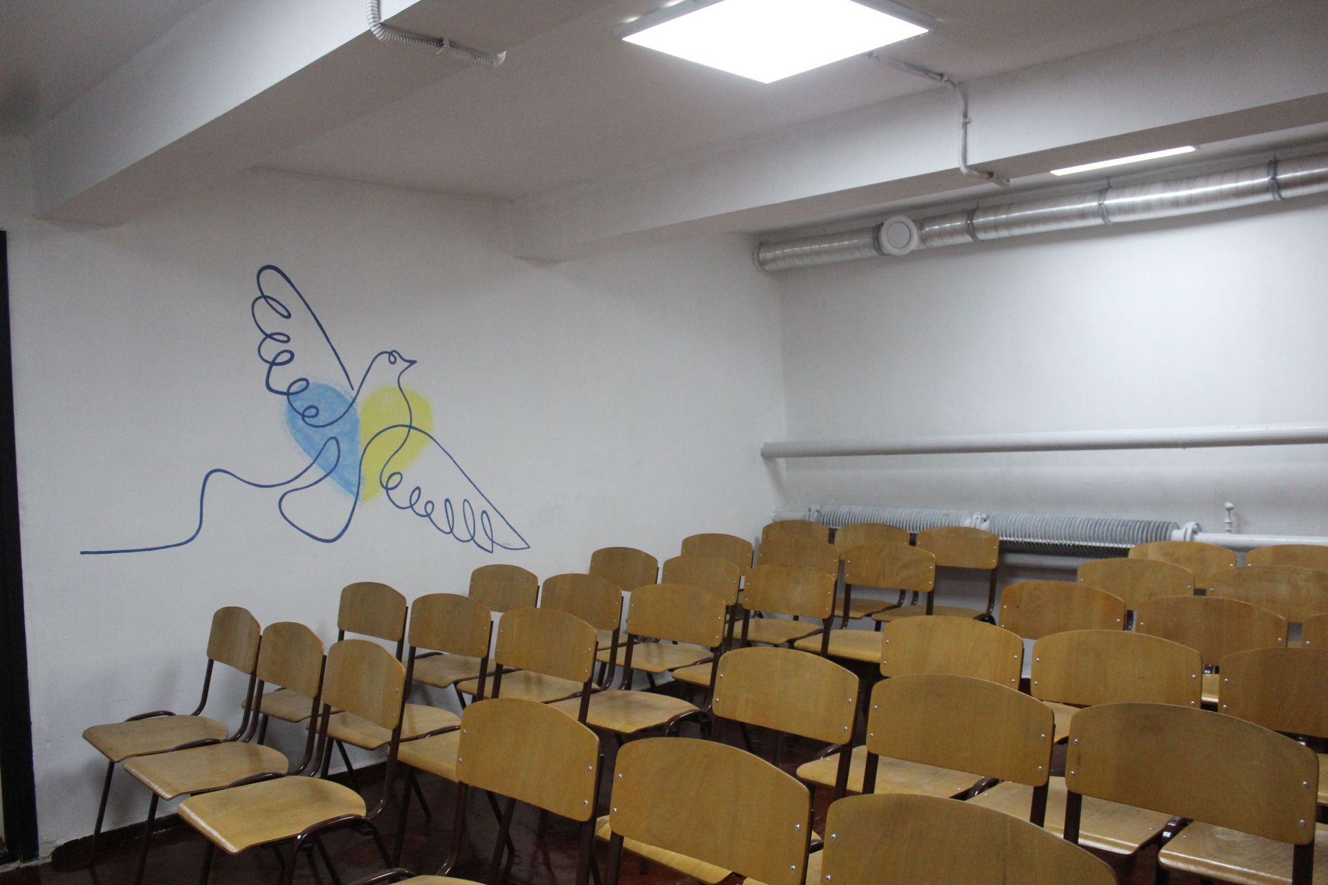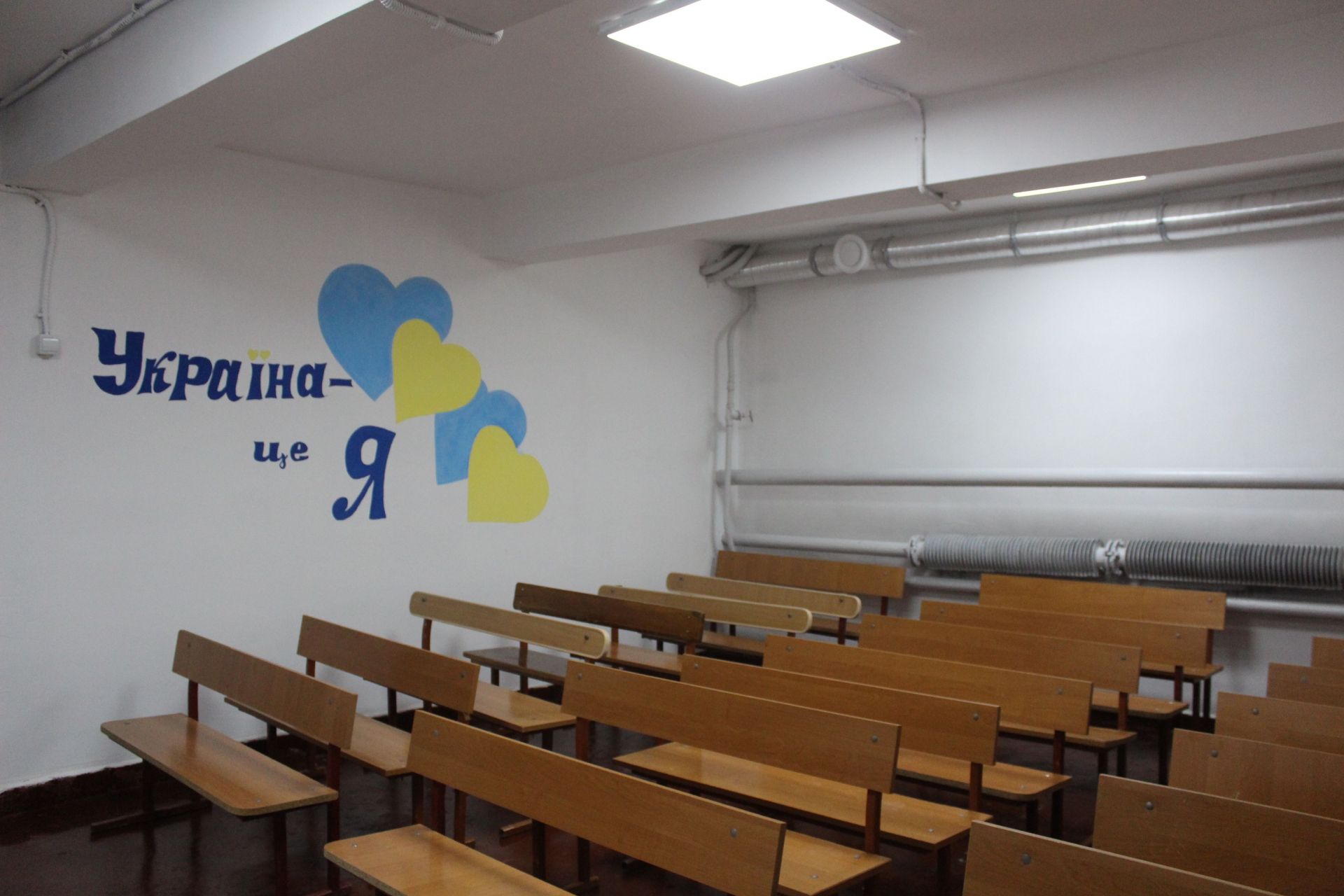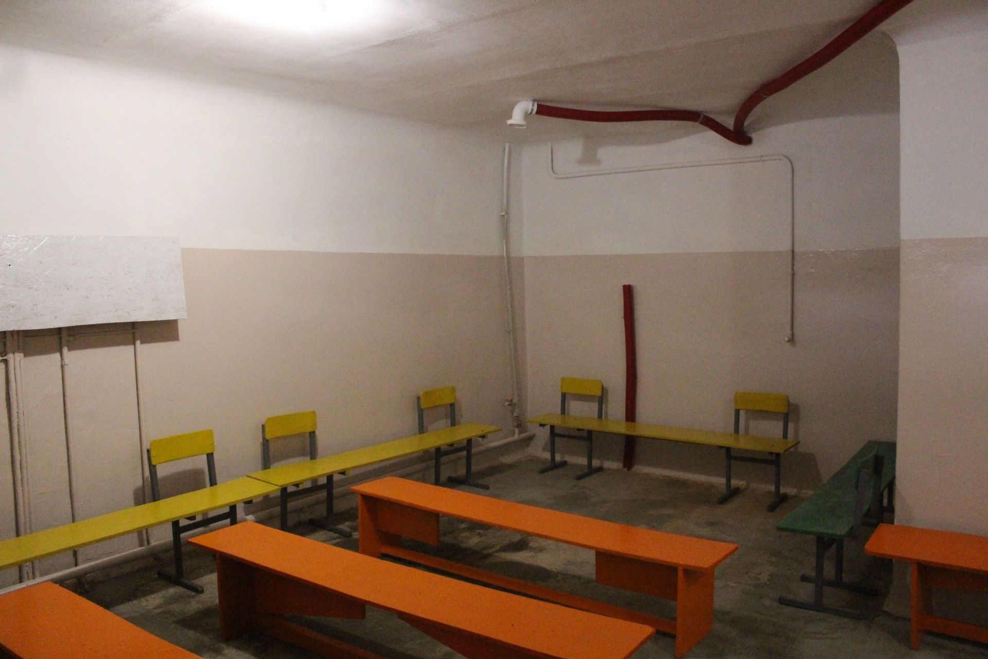 Сховище розраховане на 600 дітей, тож коли школярі навчатимуться по пів класу, цього приміщення достатньо, кажуть у школі. Воно добре освітлене. У залі для дітей стоять парти і лавки. У коридорі тепер є два туалети, раніше був один. На підлозі – бруківка.