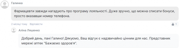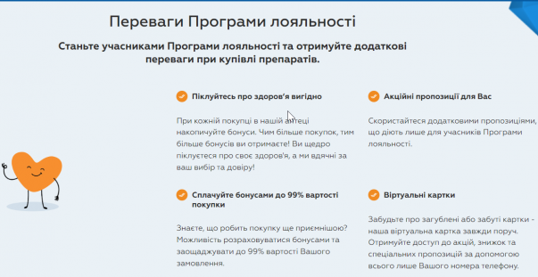Програма лояльності передбачає нарахування 1% бонусів за кожну покупку. Ці бонуси можна використовувати для оплати майже всієї вартості наступних замовлень, що робить покупки ще більш вигідними. Крім того, бонуси нараховуються за покупки в аптеках мережі, на офіційному сайті та навіть через партнерські платформи, такі як Tabletki.ua, Geoapteka та інші.