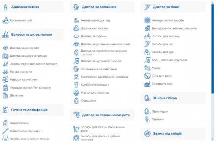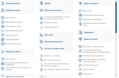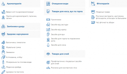 - Товари для здоров'я: ця категорія включає товари, що спрямовані на підтримку загального здоров'я, такі як замінники цукру, продукти для підтримки імунітету, а також засоби для профілактики та лікування захворювань носа, вух та горла.