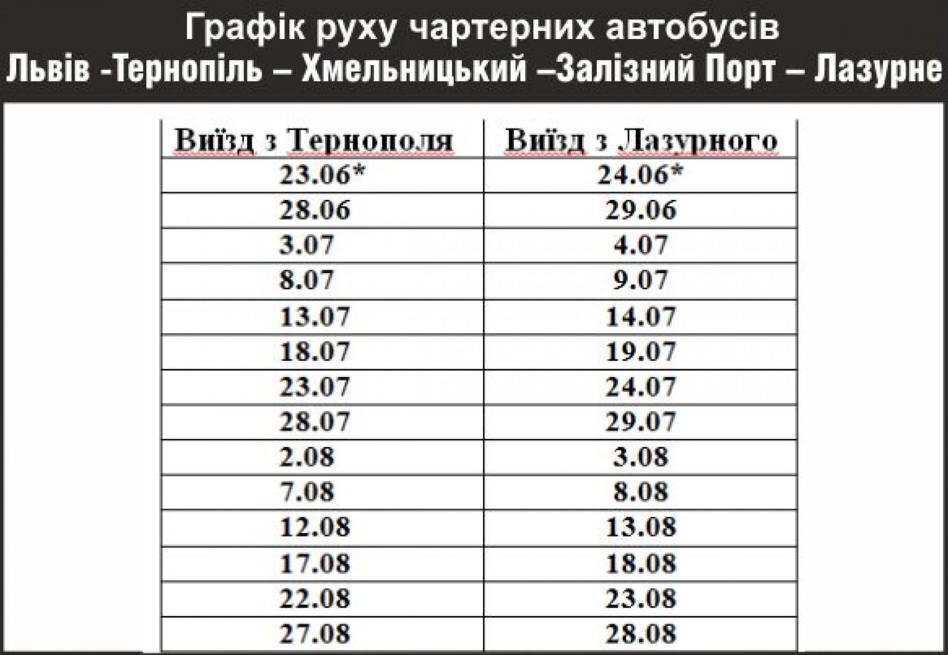 А саме: 20.06; 25.06; 01.07; 05.07; 10.07; 15.07; 20.07; 25.07 і т.д.